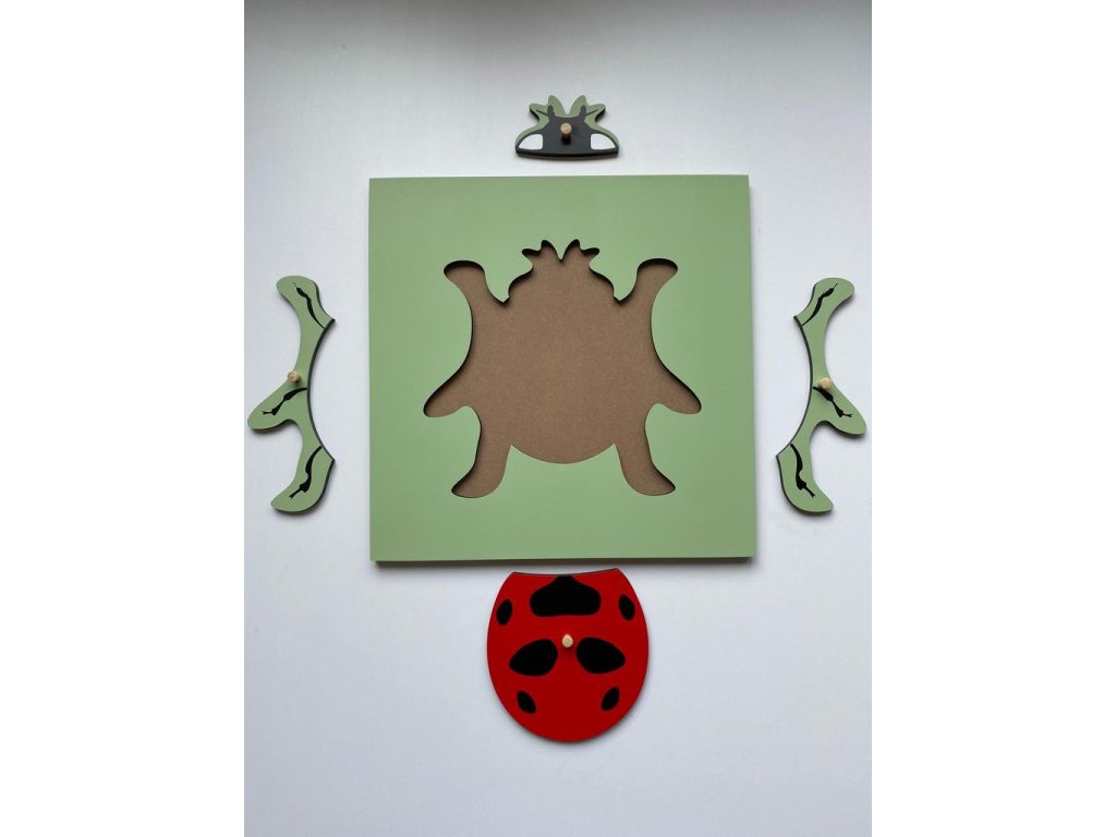 Nejprve ukážeme a předvedeme, jak jednotlivé dílky vyndaváme. Pomalu dílky vyndáme vedle rámečku. Necháme dítě, ať si libovolně skládá do rámečku, nebo mimo něj. Ze začátku nemusíme říkat, jak se jednotlivé části jmenují, to můžeme nechat na pozdější dobu. Vše předvádíme pomalu, bez většího mluvení.