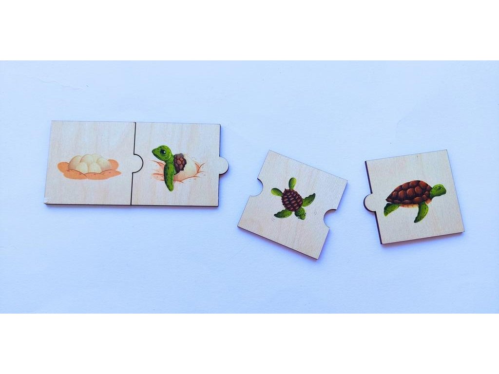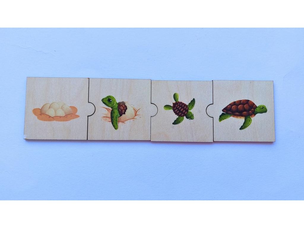 Krásné dřevěné puzzle s realistickými kresbami na posloupnost vývoje jak zvířat, tak rostlin.