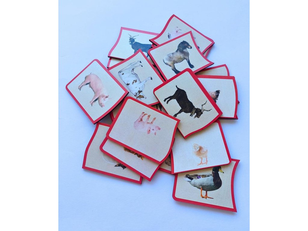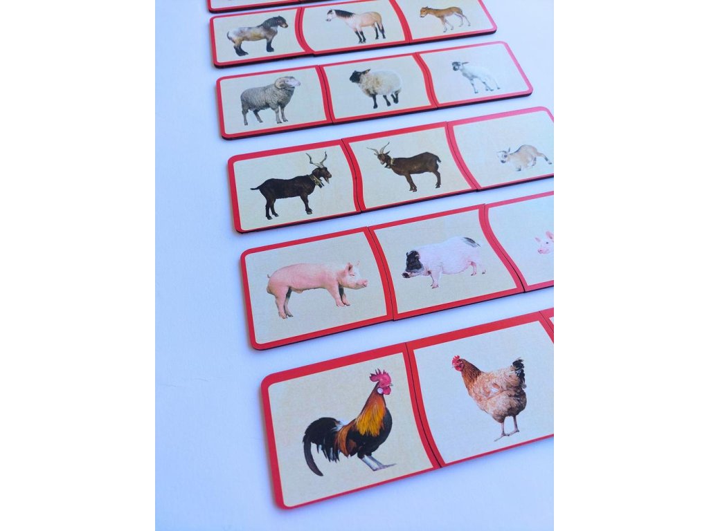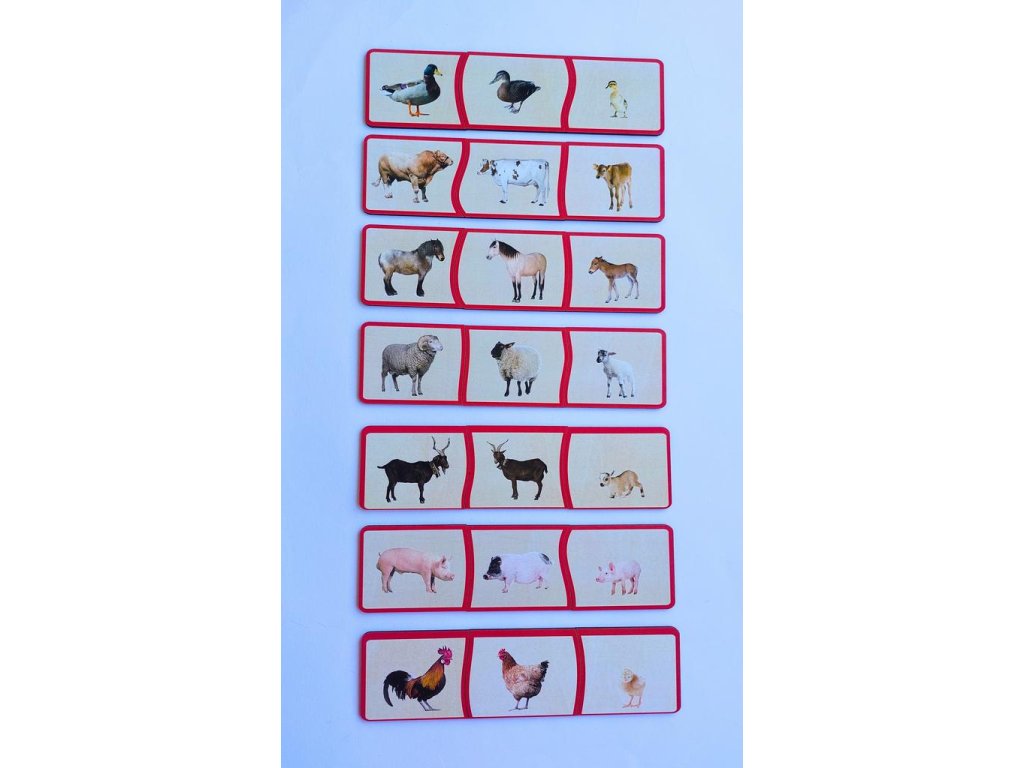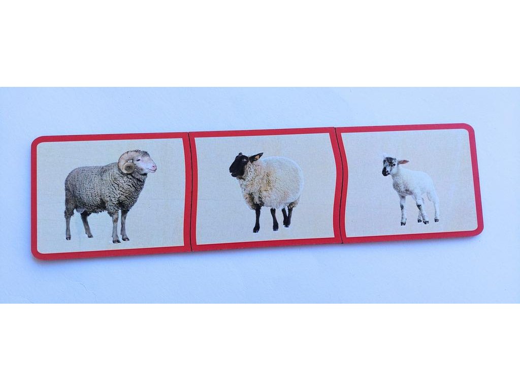 Dřevěné puzzle zvířecích rodin, kde k sobě děti přiřazují samici, samce a mládě - např.: ovci, berana a jehně.