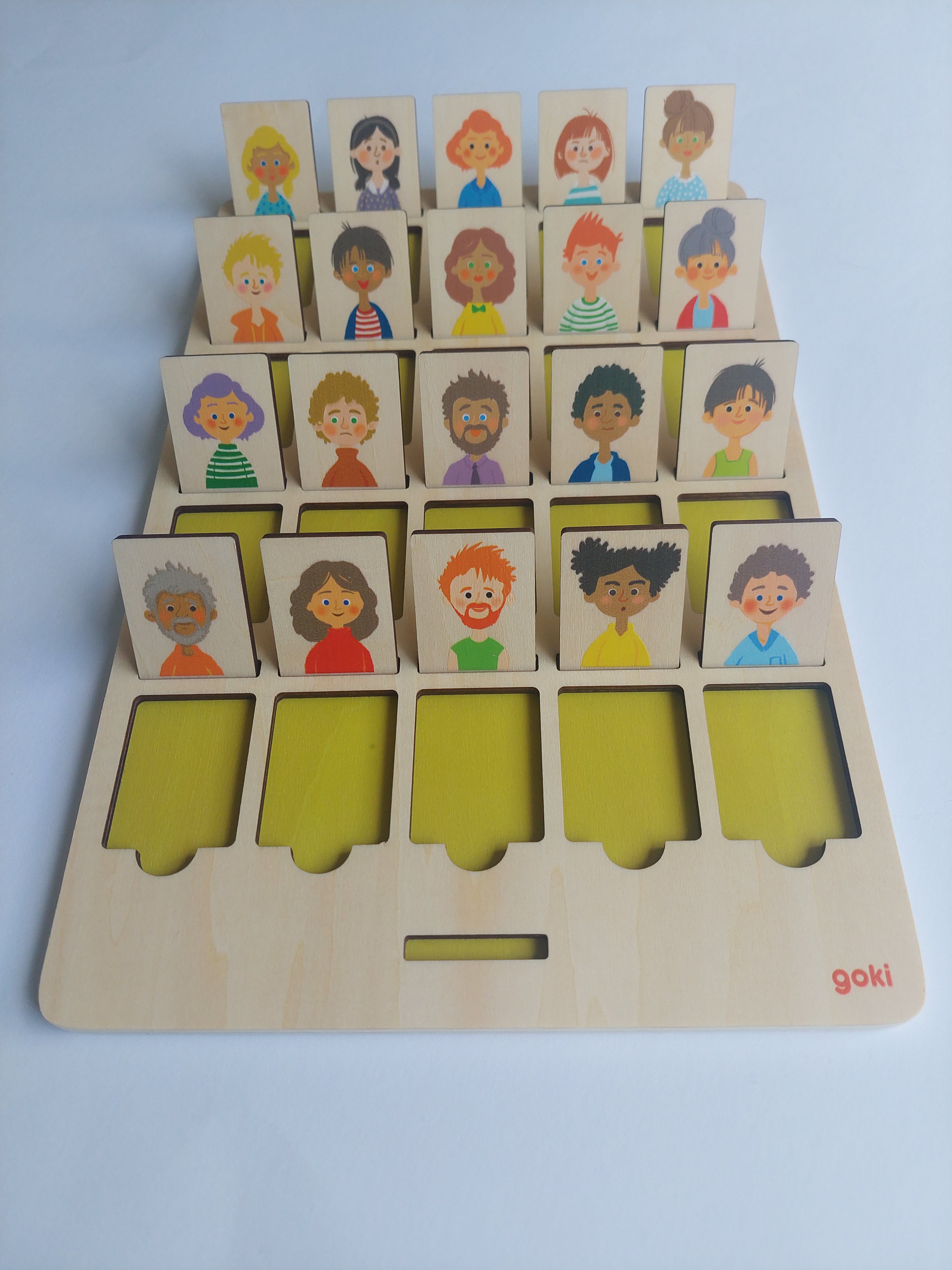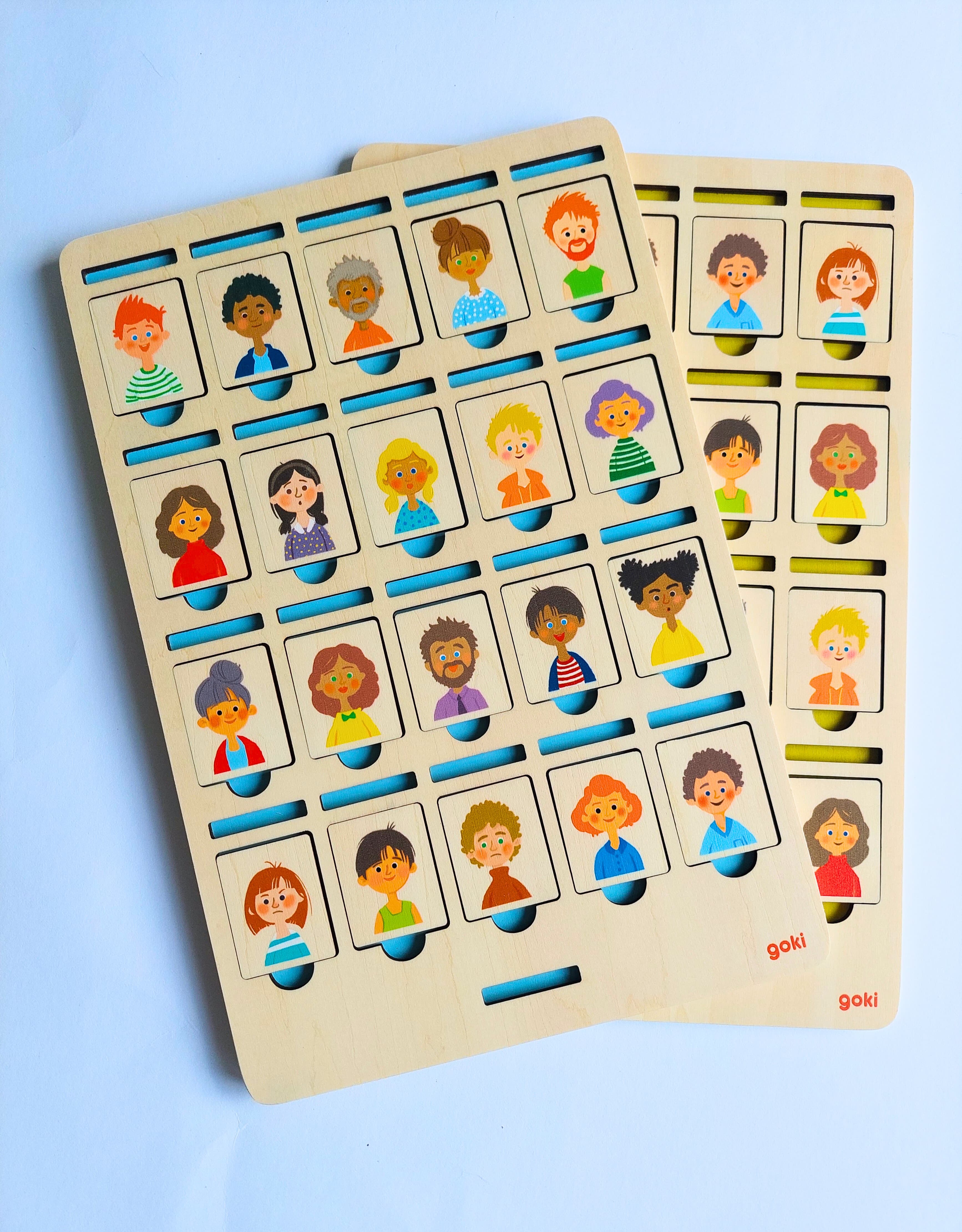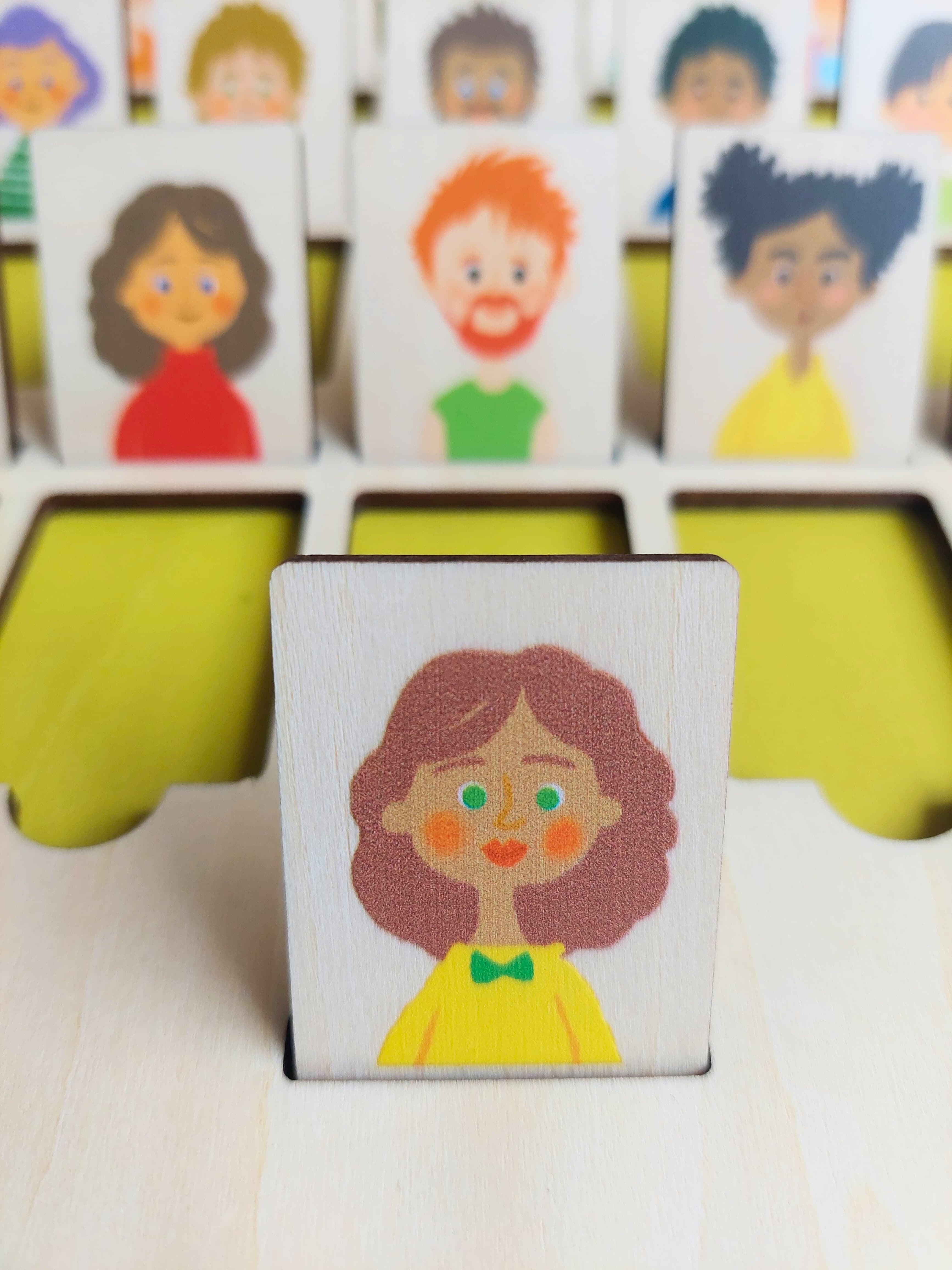 Tip: Než se pustíte do hry, můžete si obrázky společně prohlížet a zkusit jednotlivé osoby popisovat - například: "Tento pán je už starší a má šedé vlasy." "Tato paní má modré tričko s puntíky." Dítě se tak naučí, na jaké otázky se může při hře ptát.