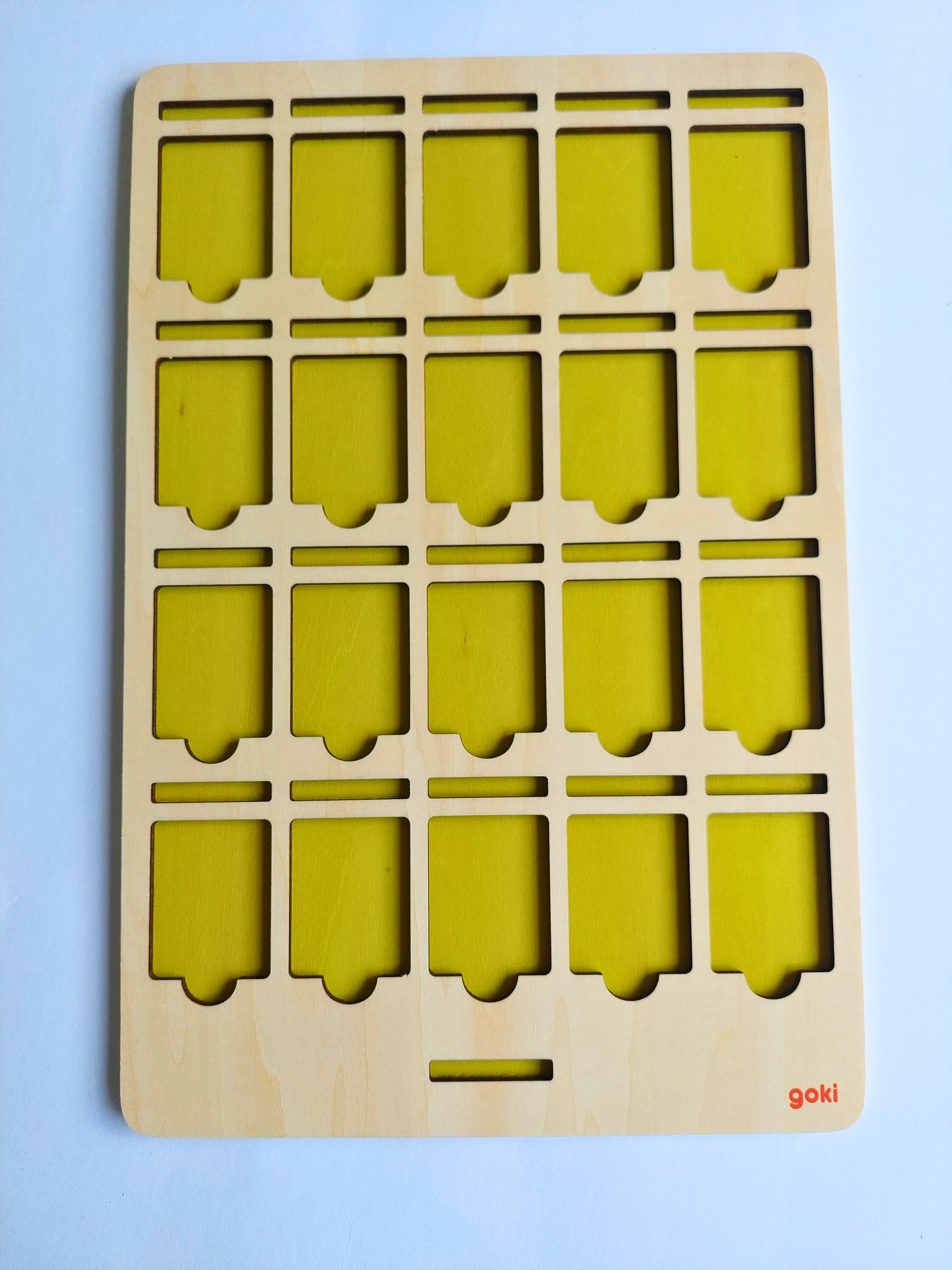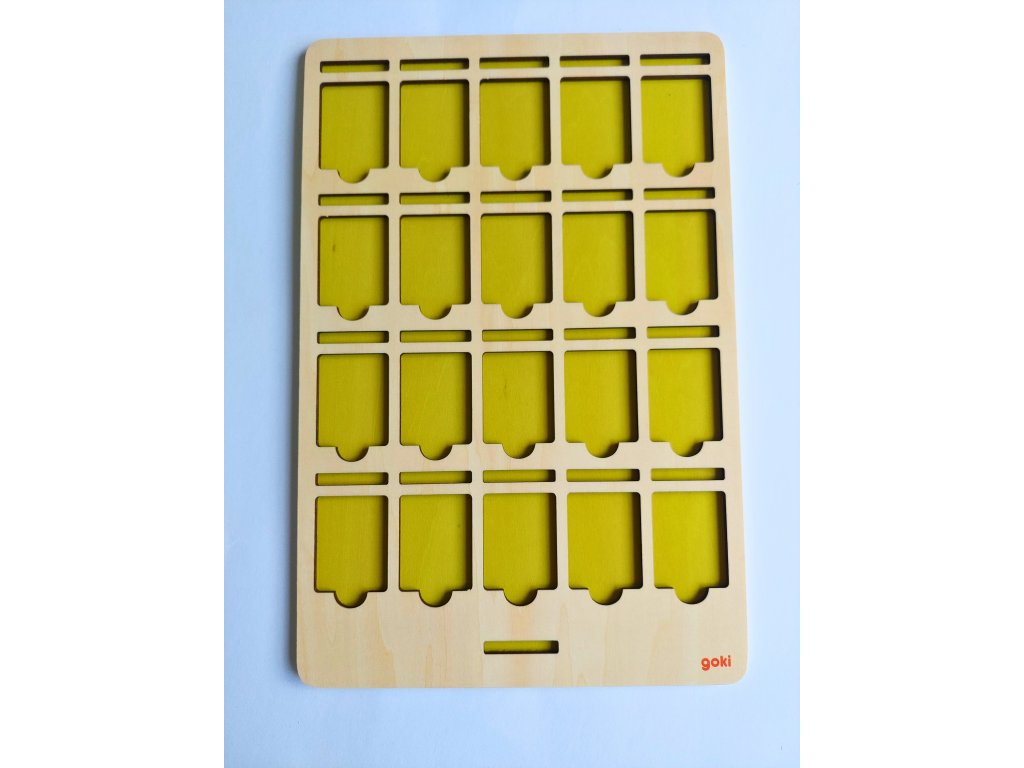 Dřevěné desky o rozměrech 20 x 30 cm jsou ve dvou barvách - zelená a modrá. Obě desky mají stejné výřezy, do kterých se