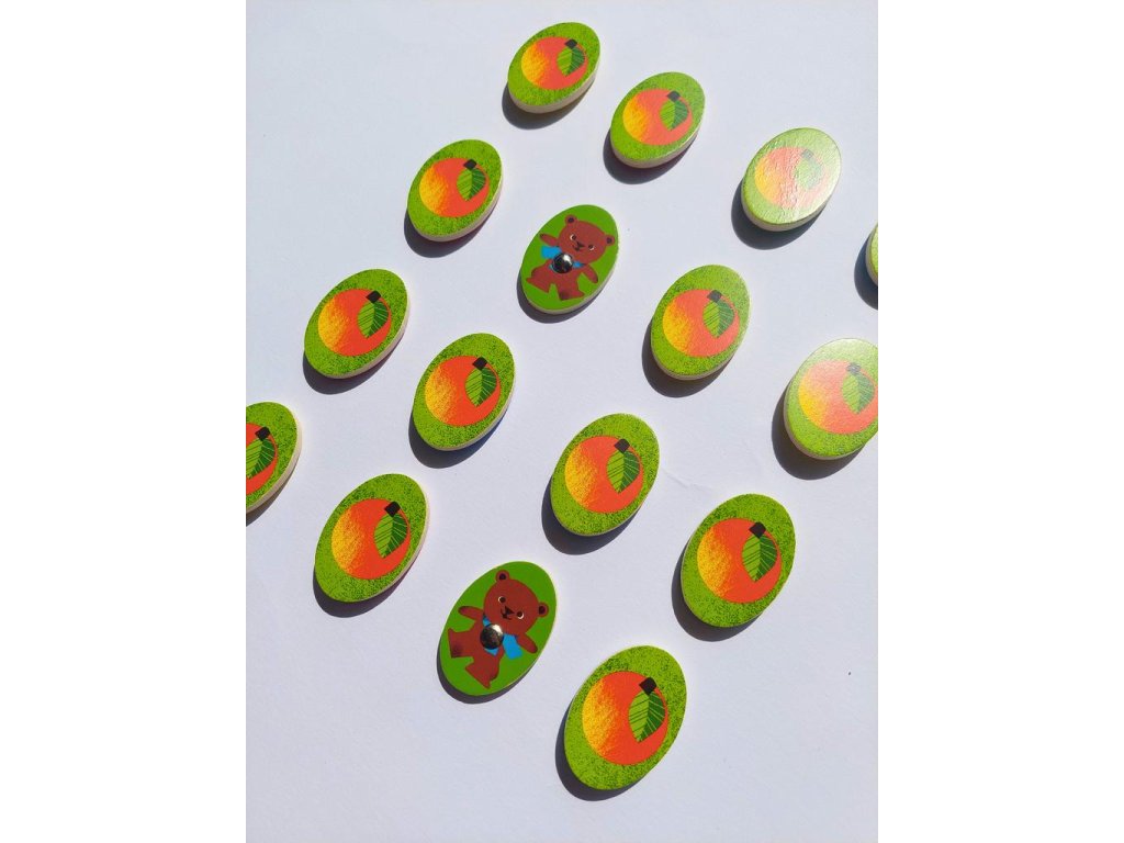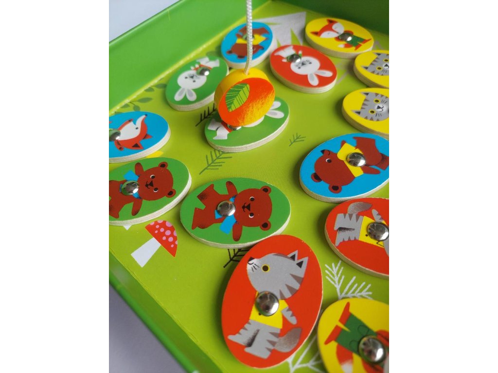 Dřevěné destičky, které slouží jako pexeso mají z druhé strany magnet. Součástí balení je prut s provázkem a s jablíčkem na konci, kterým se dají zvířátka chytat. Pro praktičnost doporučuji připravit zvířátka do krabice, která má z vnitřní strany ilustraci lesa.