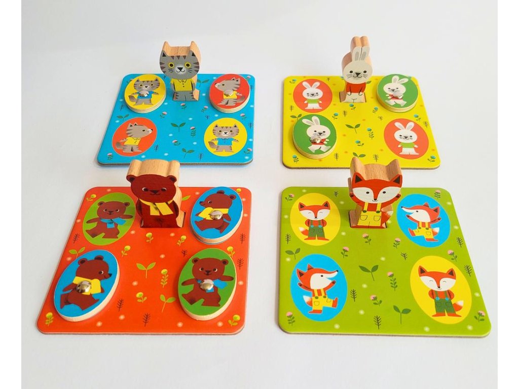 Pexeso je nakreslené na dřevěných destičkách - dohromady má 8 párů a jsou na něm nakreslená lesní zvířátka. Stejný pár má také vždy stejně barevné pozadí. Oproti klasickému papírovému pexesu se toto pexeso neohýbá, jde snadno otáčet a vydrží mnohem déle.