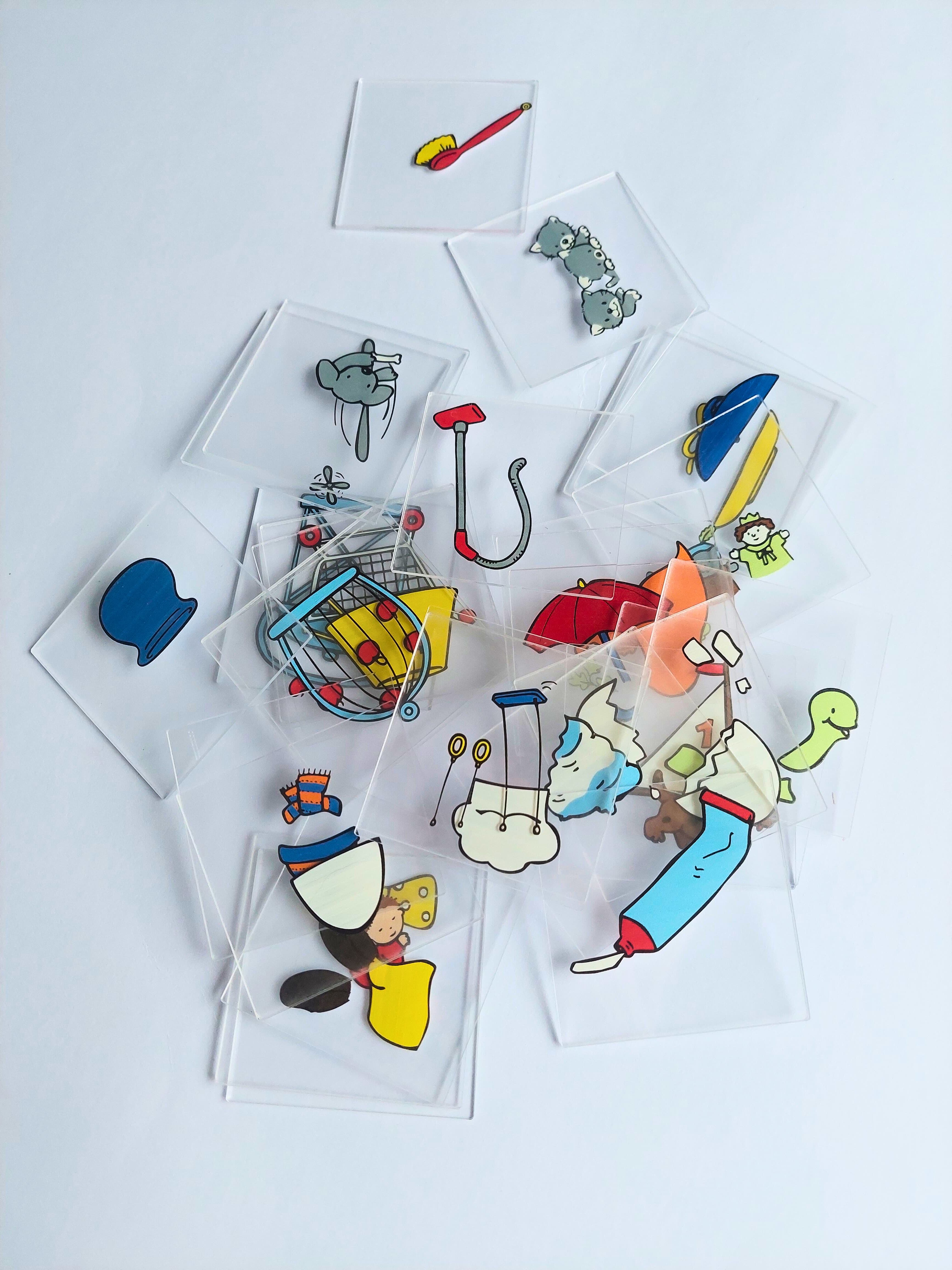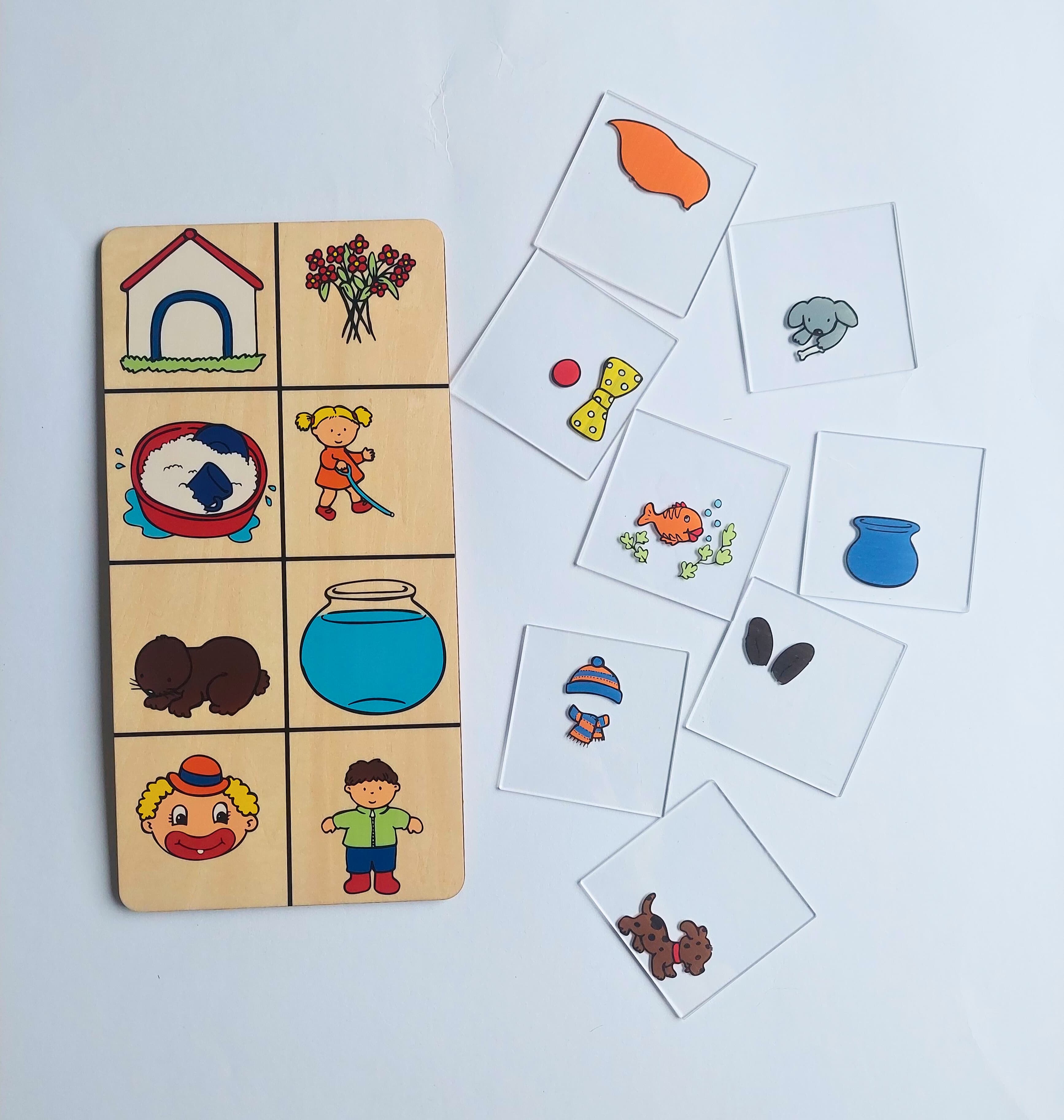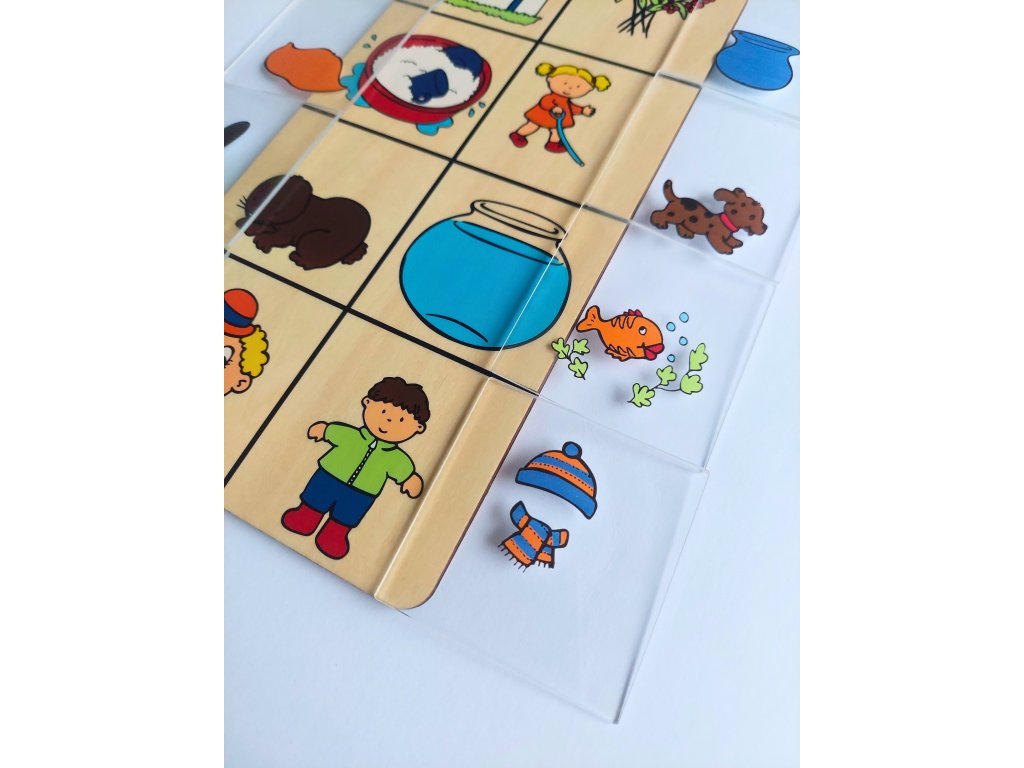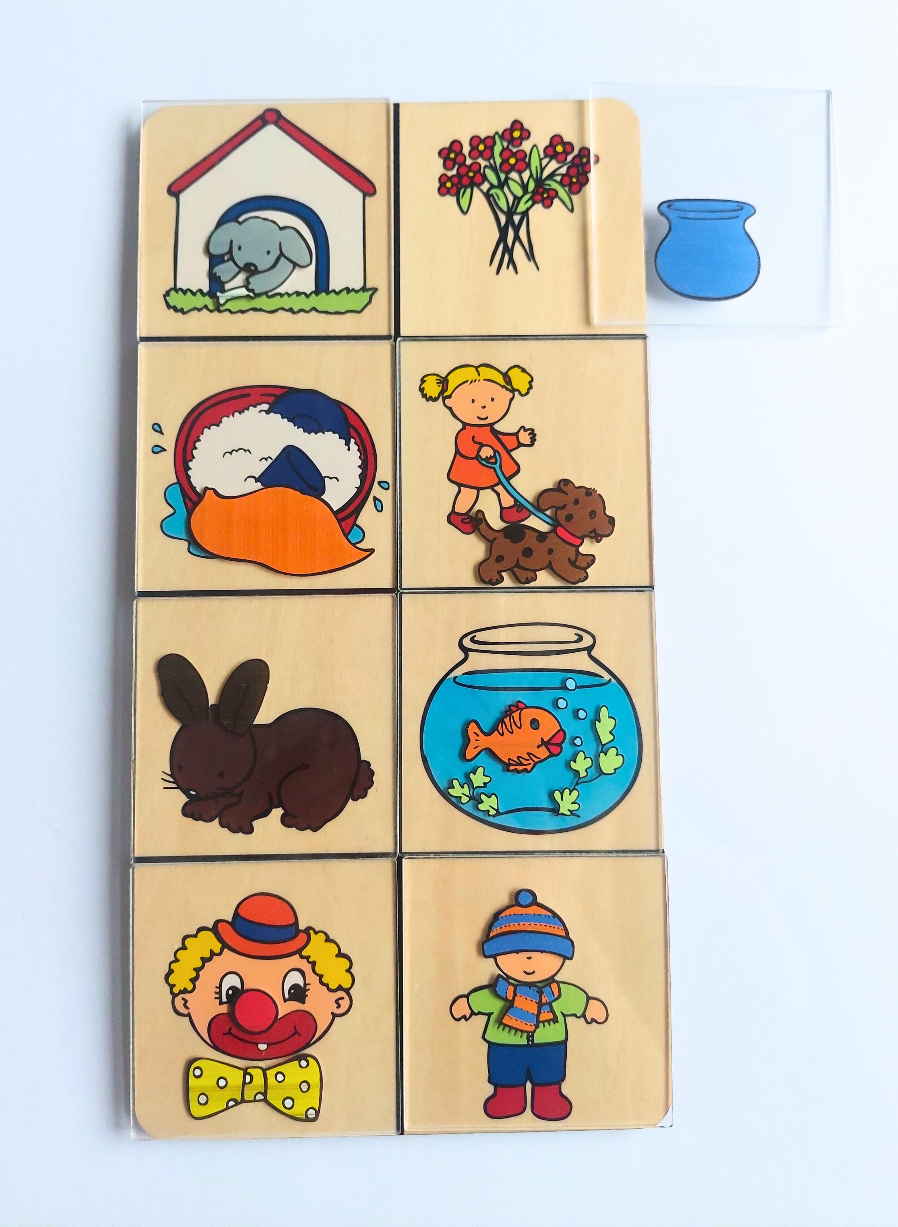 Není potřeba vzít tuto hru a hned přikládat průhledné kartičky. Můžeme s dětmi nejdříve hádat, co asi obrázkům chybí. Ať už na dřevěných deskách nebo na průhledných kartičkách. I když je někdy odpověď jasná, klidně můžeme říct více věcí, co by k obrázku mohlo pasovat. Děti si tím rozvíjí představivost a slovní zásobu. Příklad: Akvárium - ryba, šnek, rostliny, bubliny, písek...