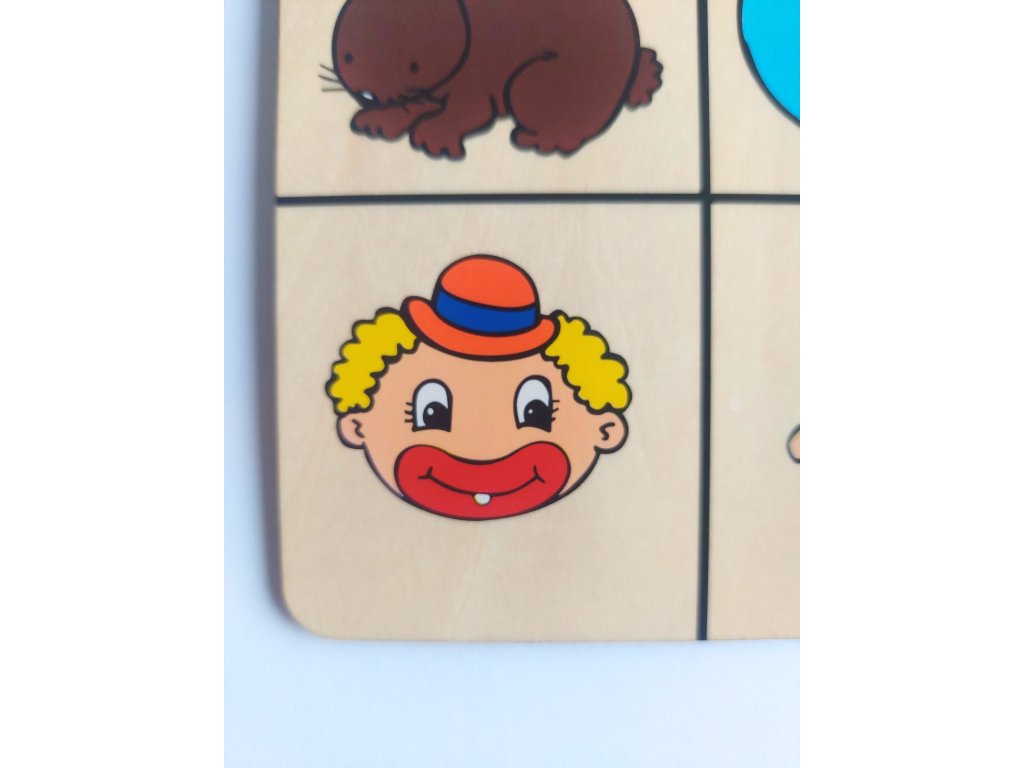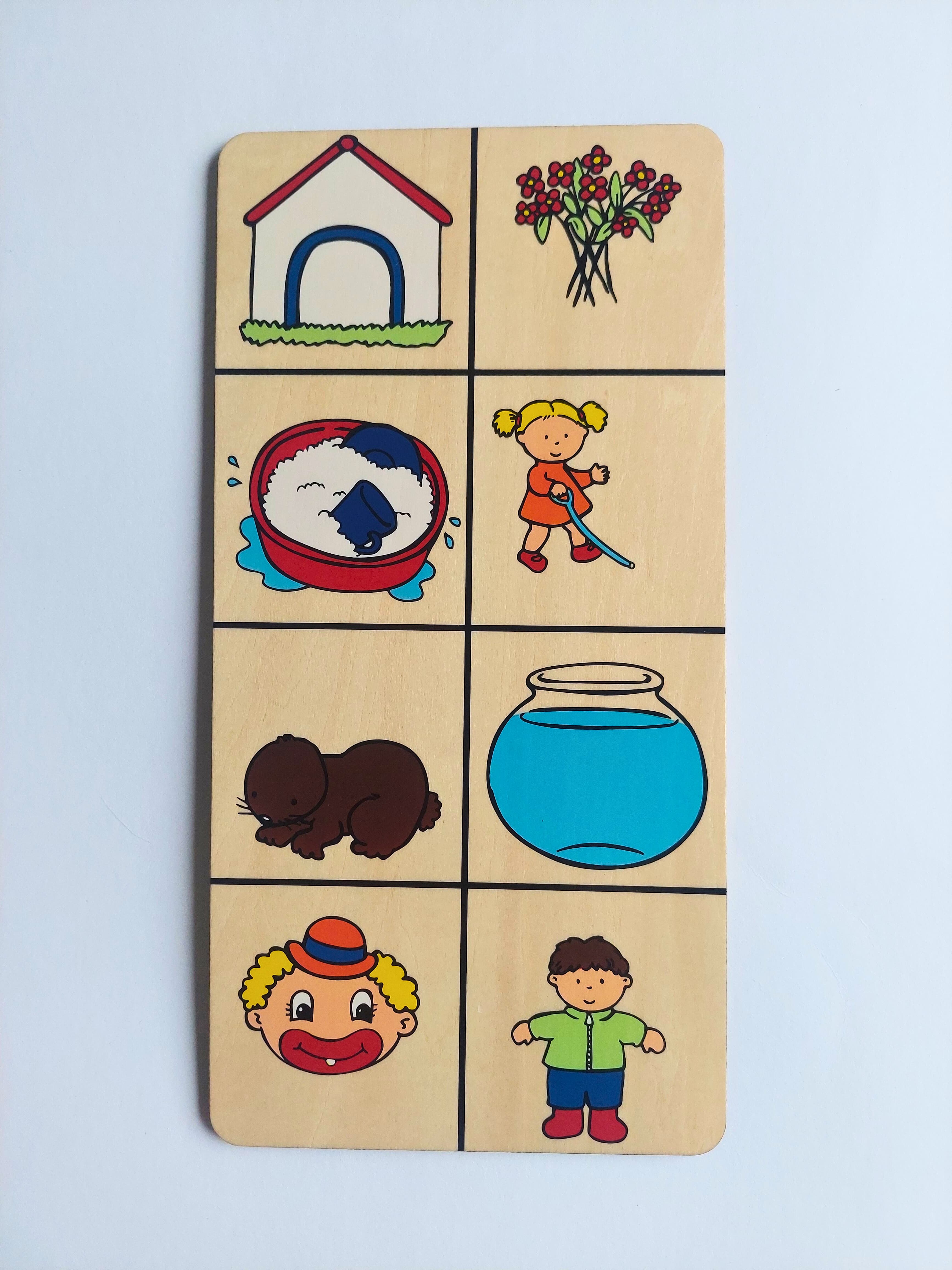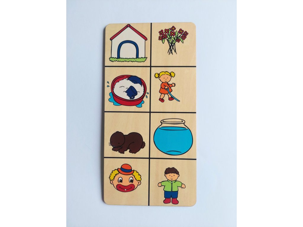 Dřevěné desky o rozměrech 12 x 24 cm obsahují vždy 8 neúplných obrázků.
