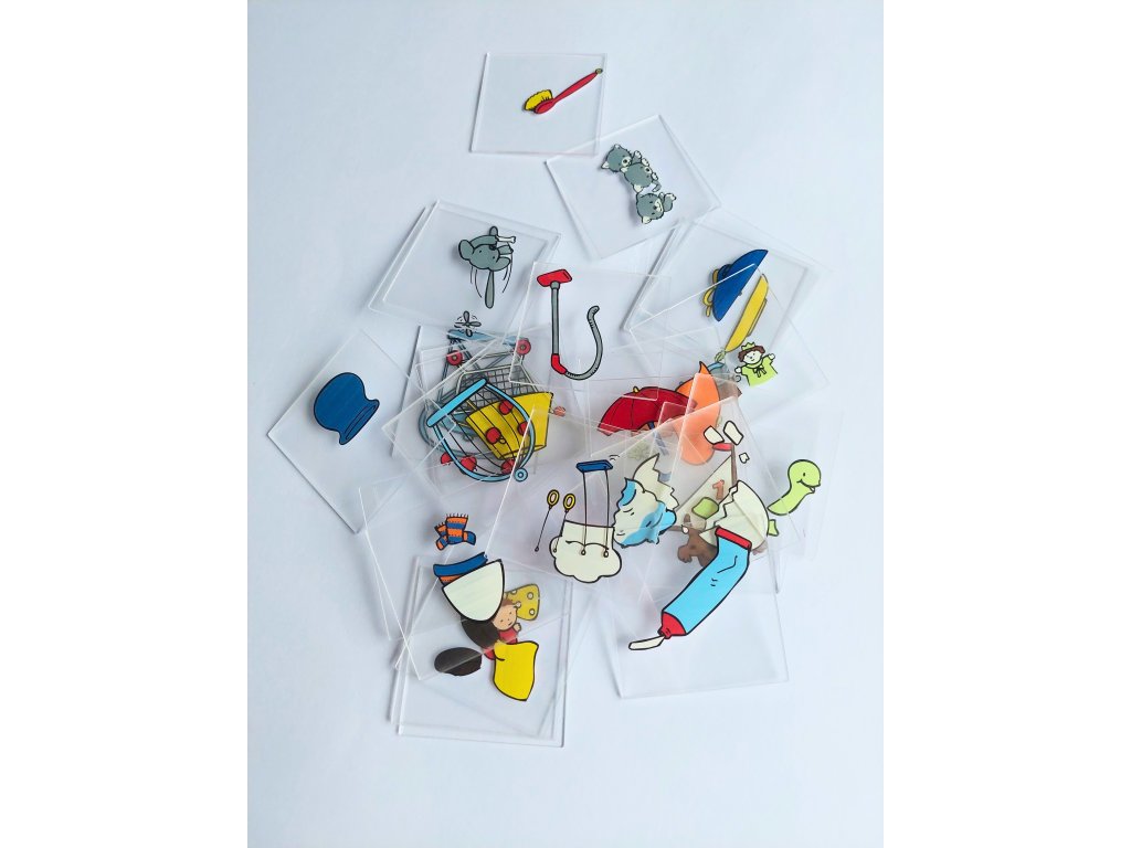 Plastové průhledné kartičky o rozměrech 6 x 6 cm na sobě mají druhou část obrázku.
