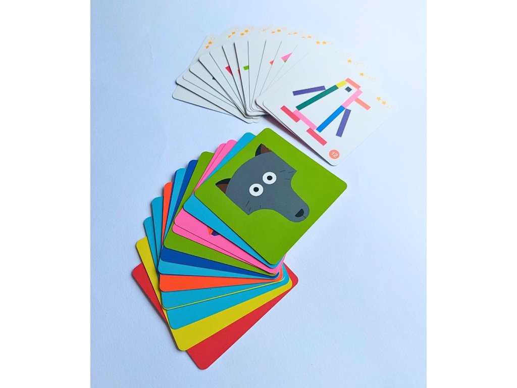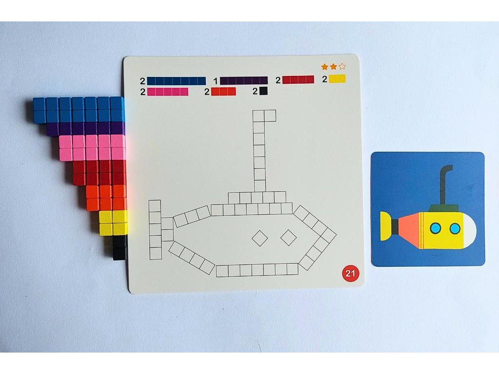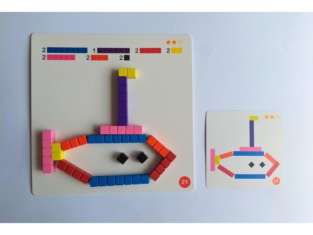 Po naskládání všech kostiček si dítě může otočit malou kartičku, kde najde správné řešení a samo si svůj výtvor zkontrolovat.