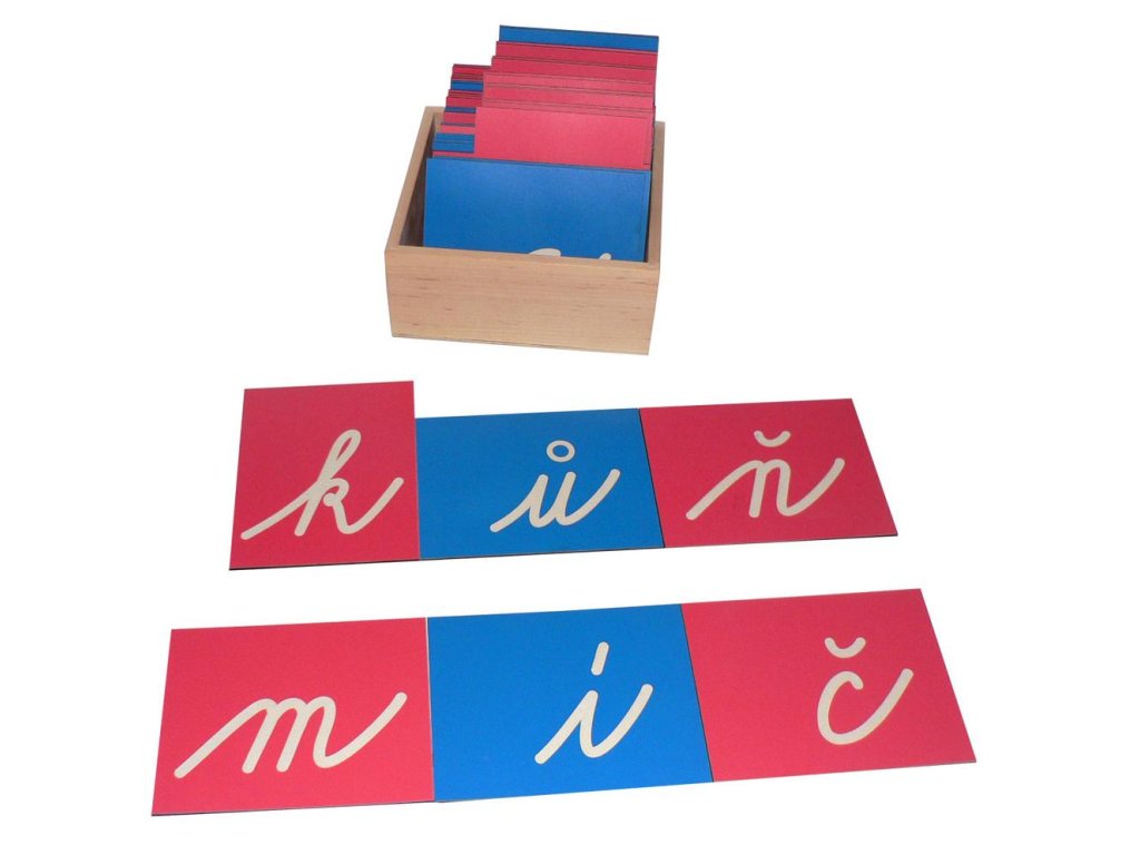 42 destiček - písmen (růžové souhlásky, modré samohlásky). Destičky mají rozměry 15 x 20 cm.