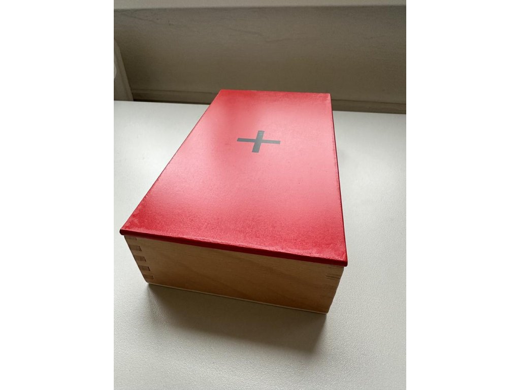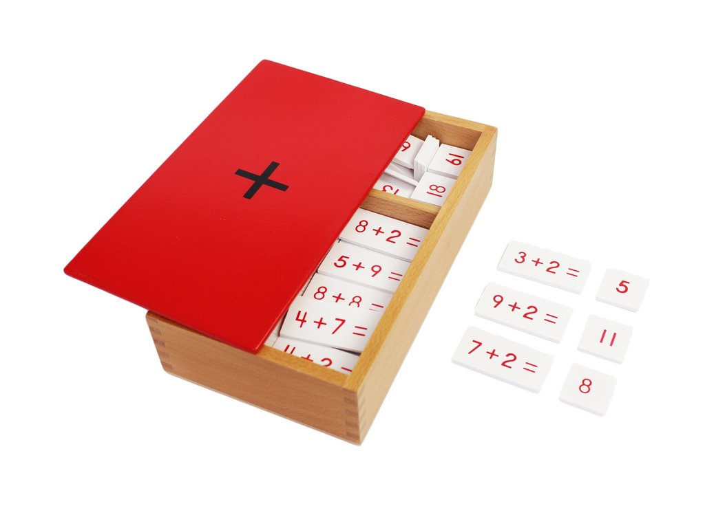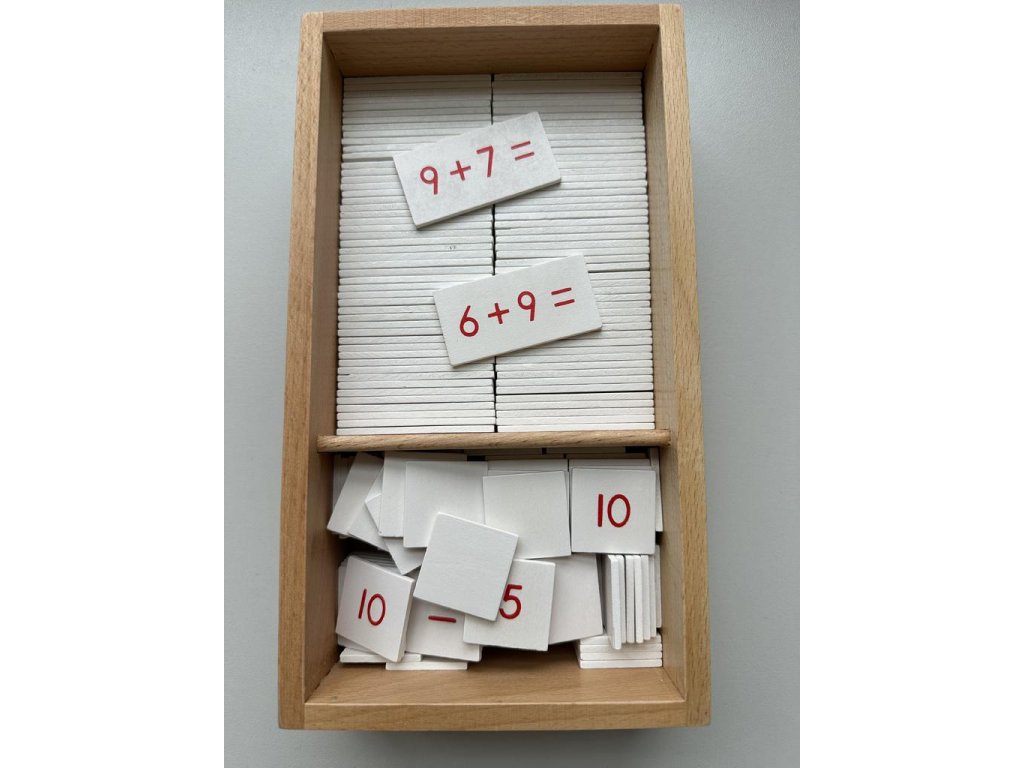 Krabička je dřevěná a má dvě přihrádky. V jedné jsou kartičky s příklady, ve druhé výsledky.