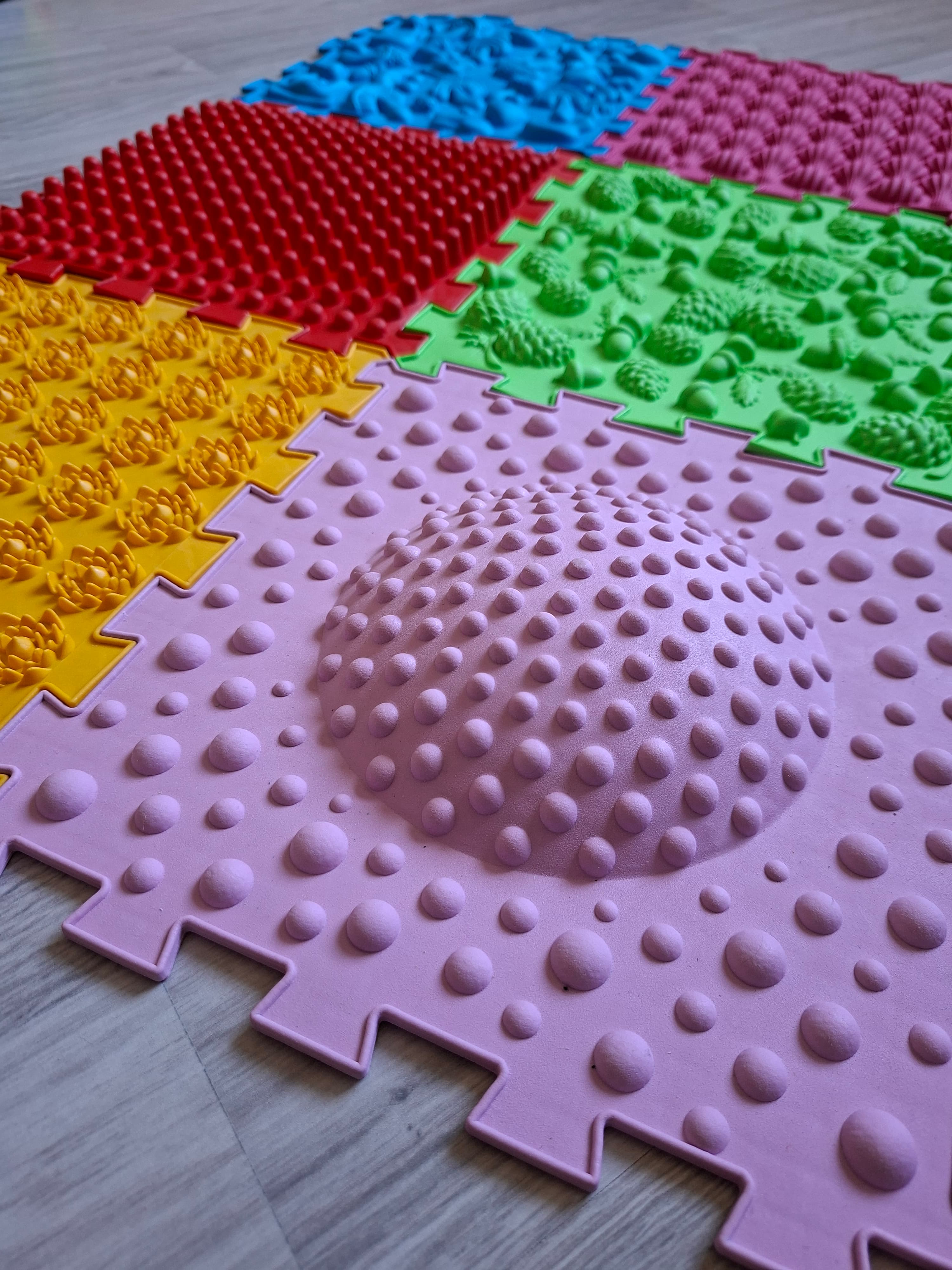 Tyto ortopedické puzzle pro děti s výraznou masážní polokoulí jsou navržené pro přirozenou stimulaci chodidel a podporu zdravého vývoje nohou. Speciální povrch napodobuje nerovný terén, díky čemuž dochází k aktivaci svalů chodidel a posílení klenby.
