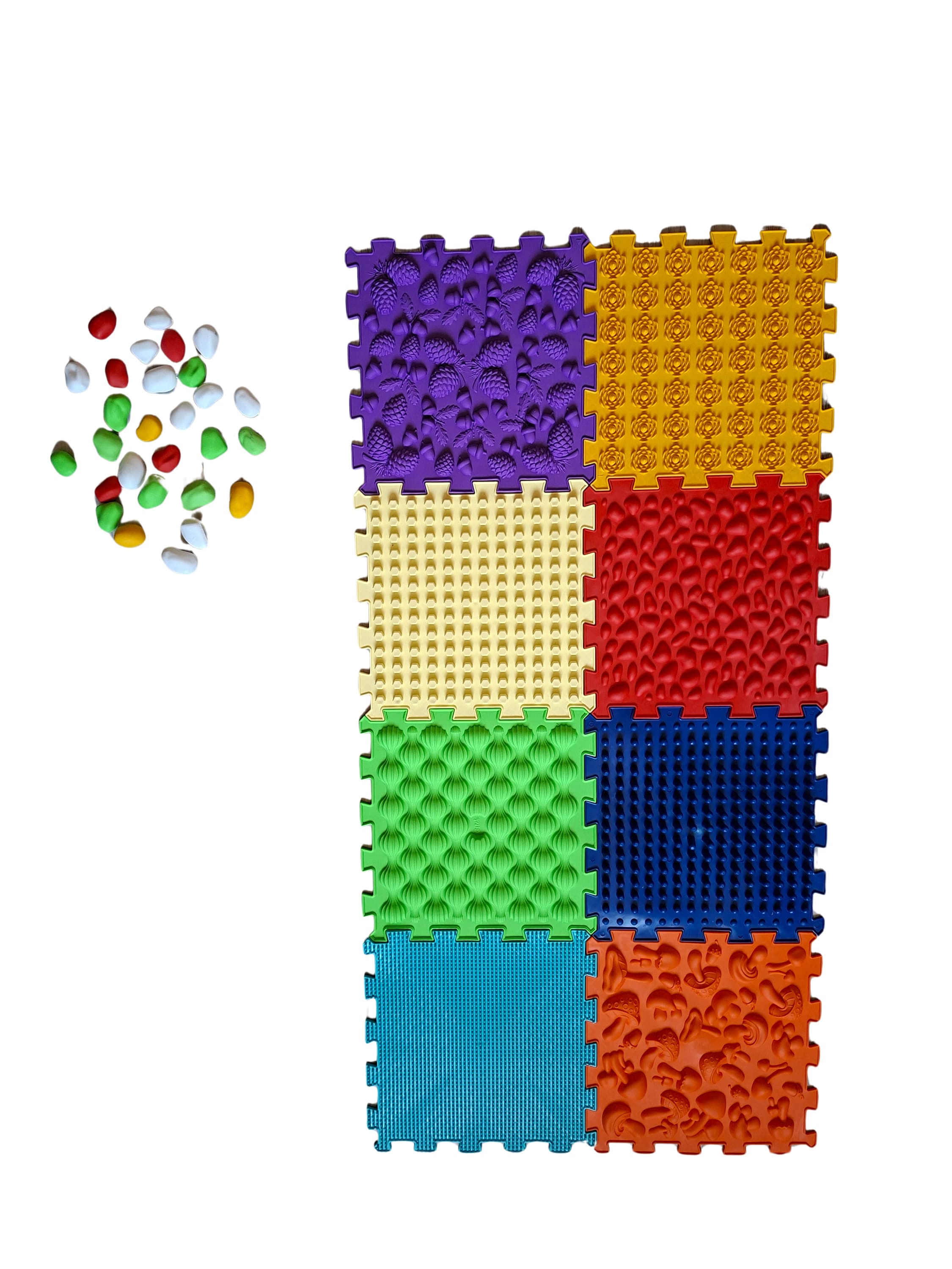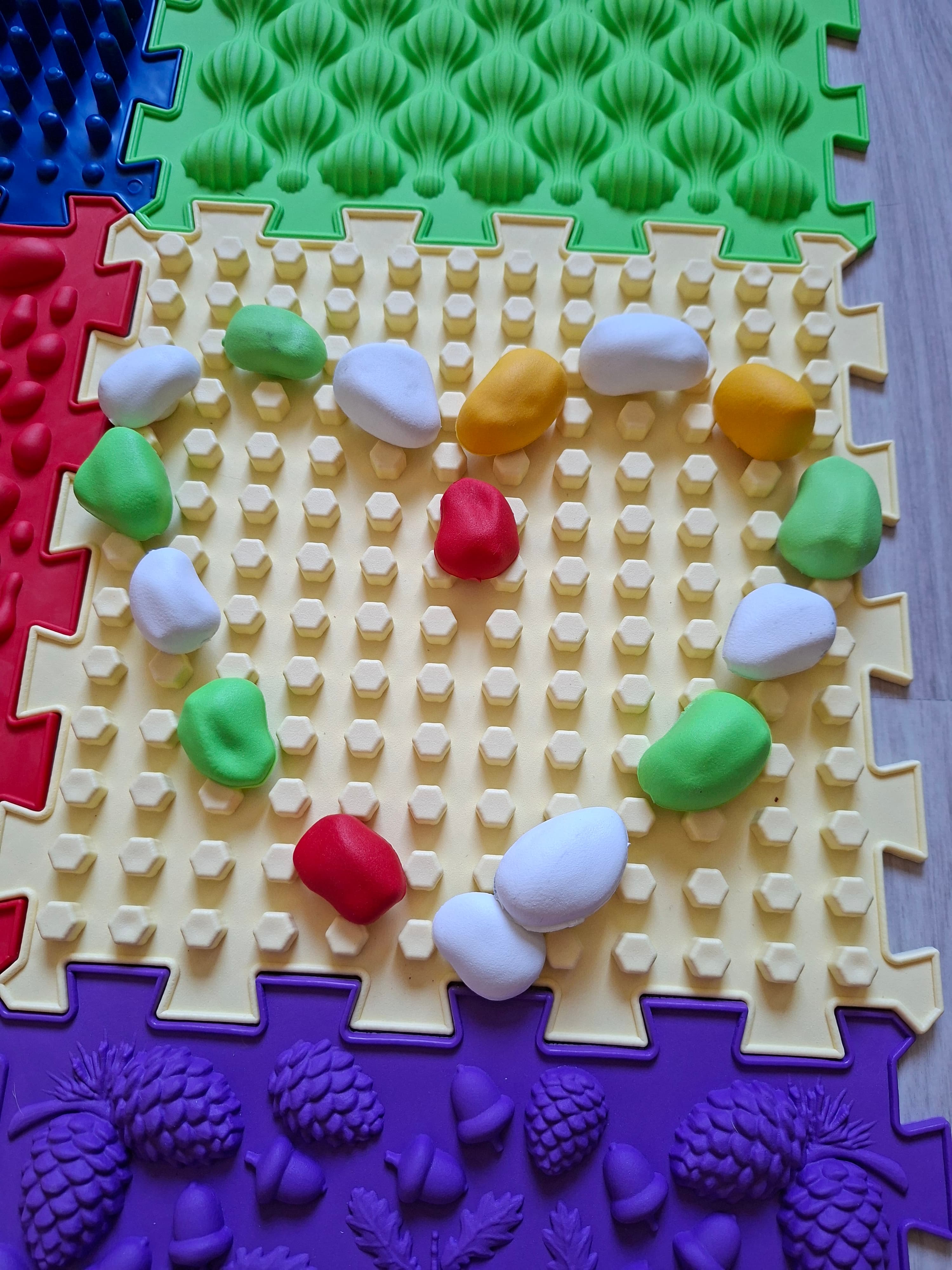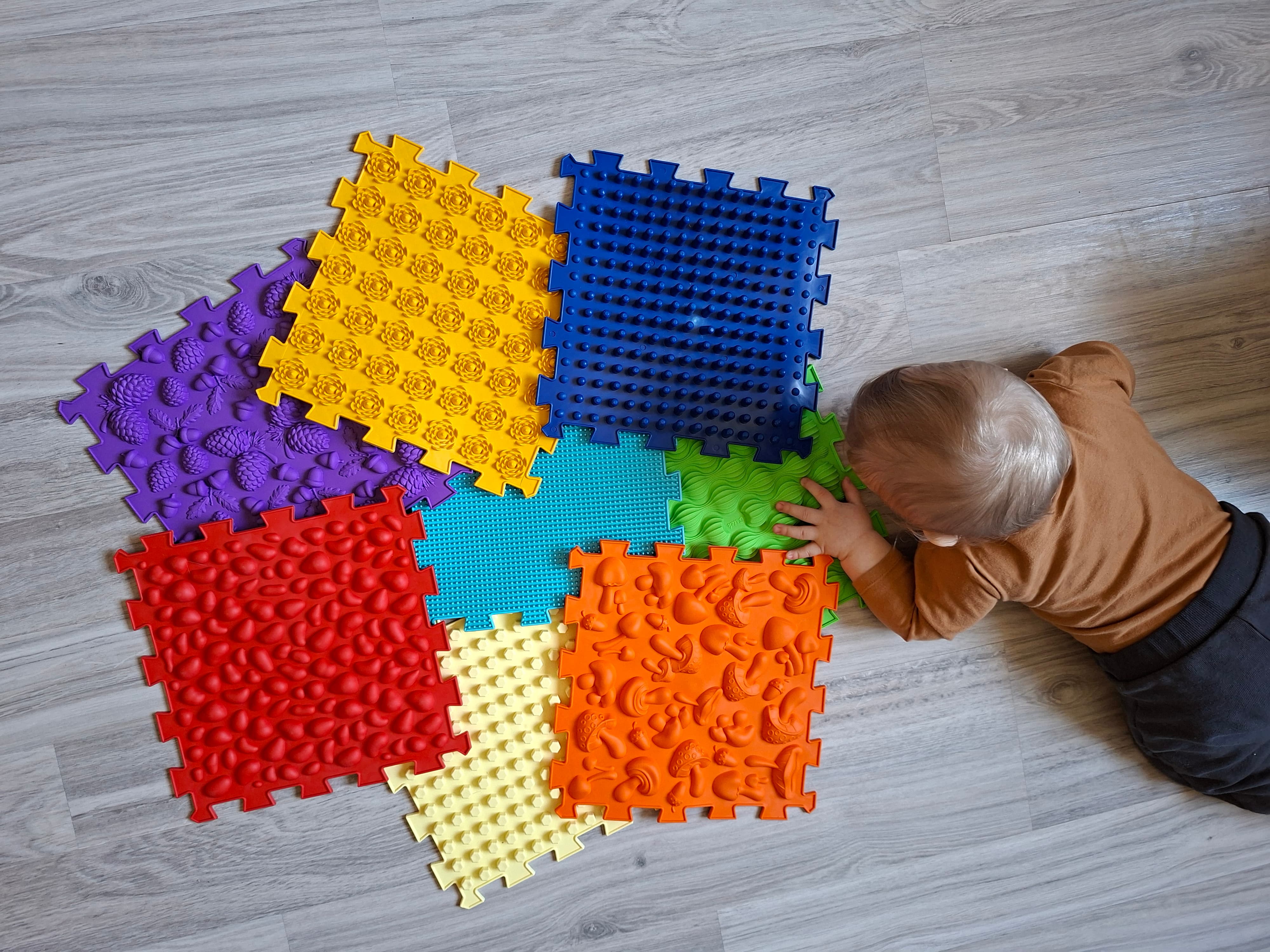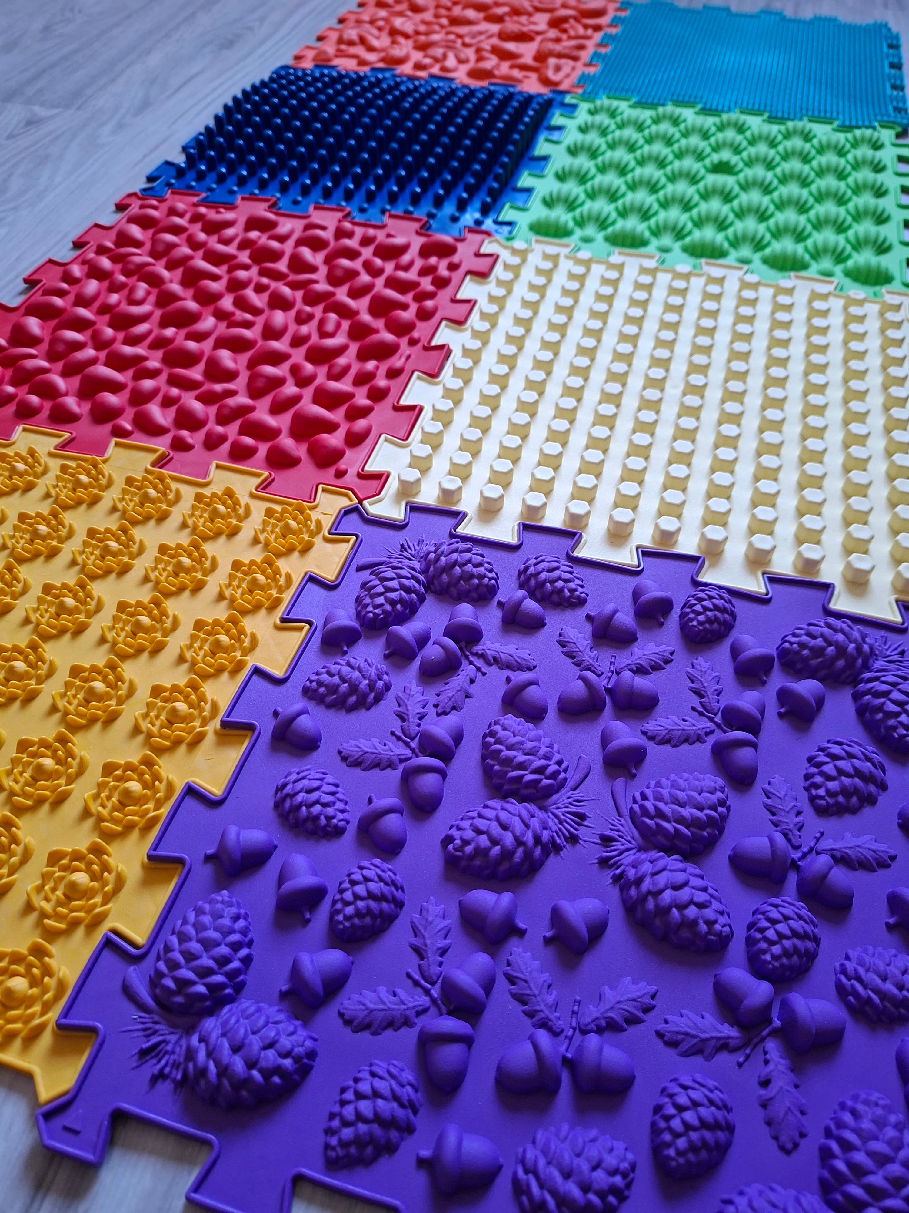 Tyto ortopedické puzzle pro děti jsou navržené pro přirozenou stimulaci chodidel a podporu zdravého vývoje nohou. Speciální povrch napodobuje nerovný terén, díky čemuž dochází k aktivaci svalů chodidel a posílení klenby.
