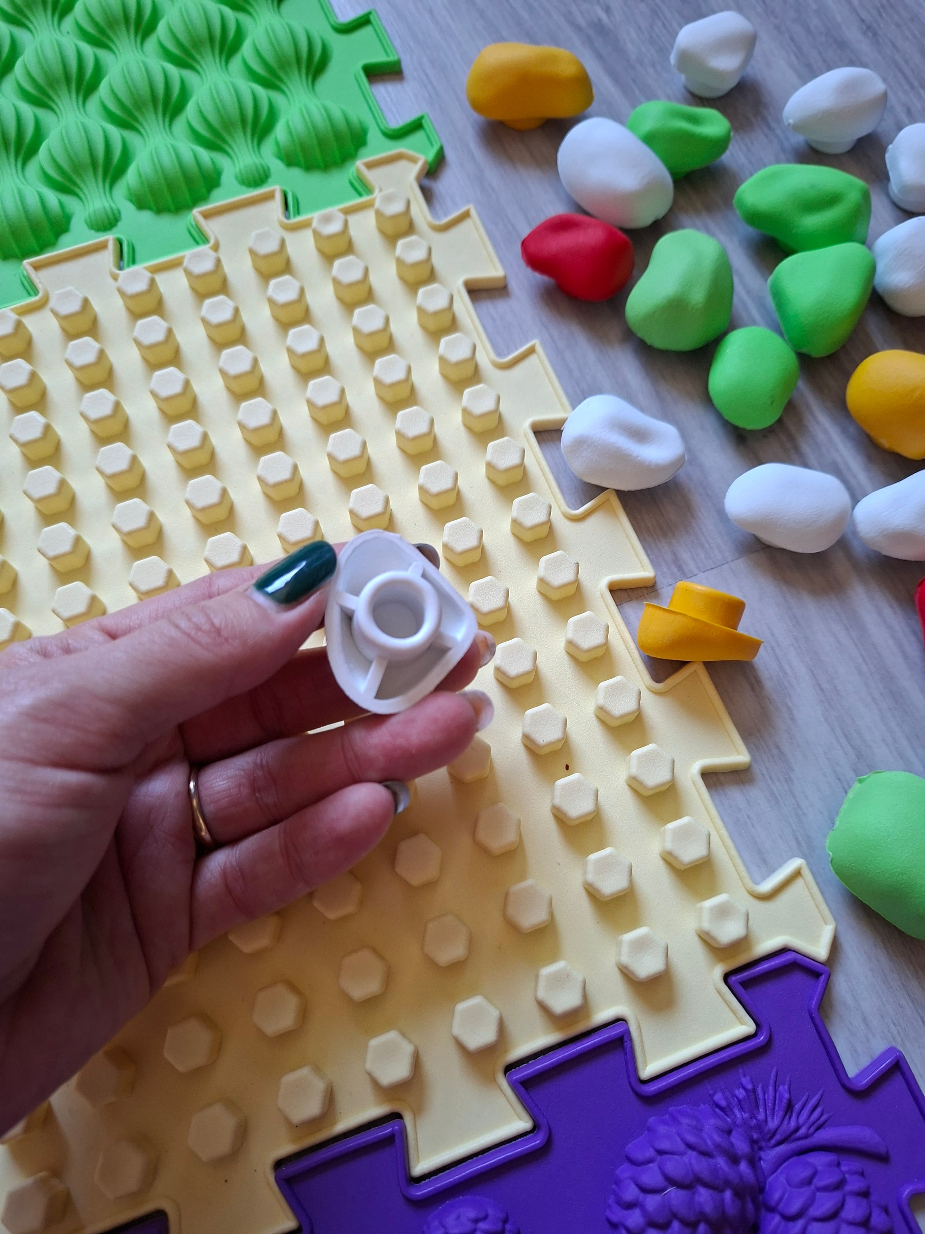Tyto ortopedické puzzle pro děti jsou navržené pro přirozenou stimulaci chodidel a podporu zdravého vývoje nohou. Speciální povrch napodobuje nerovný terén, díky čemuž dochází k aktivaci svalů chodidel a posílení klenby.