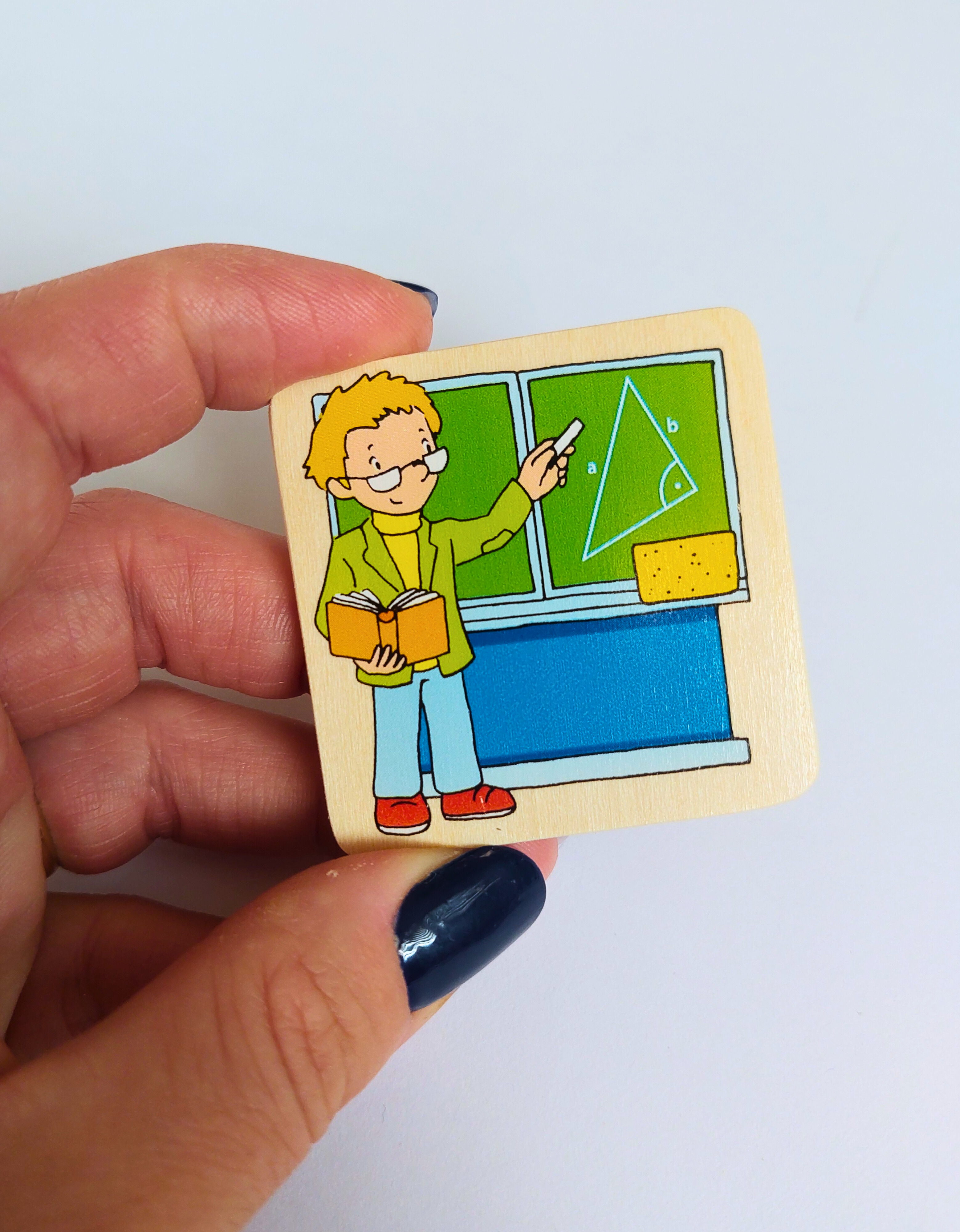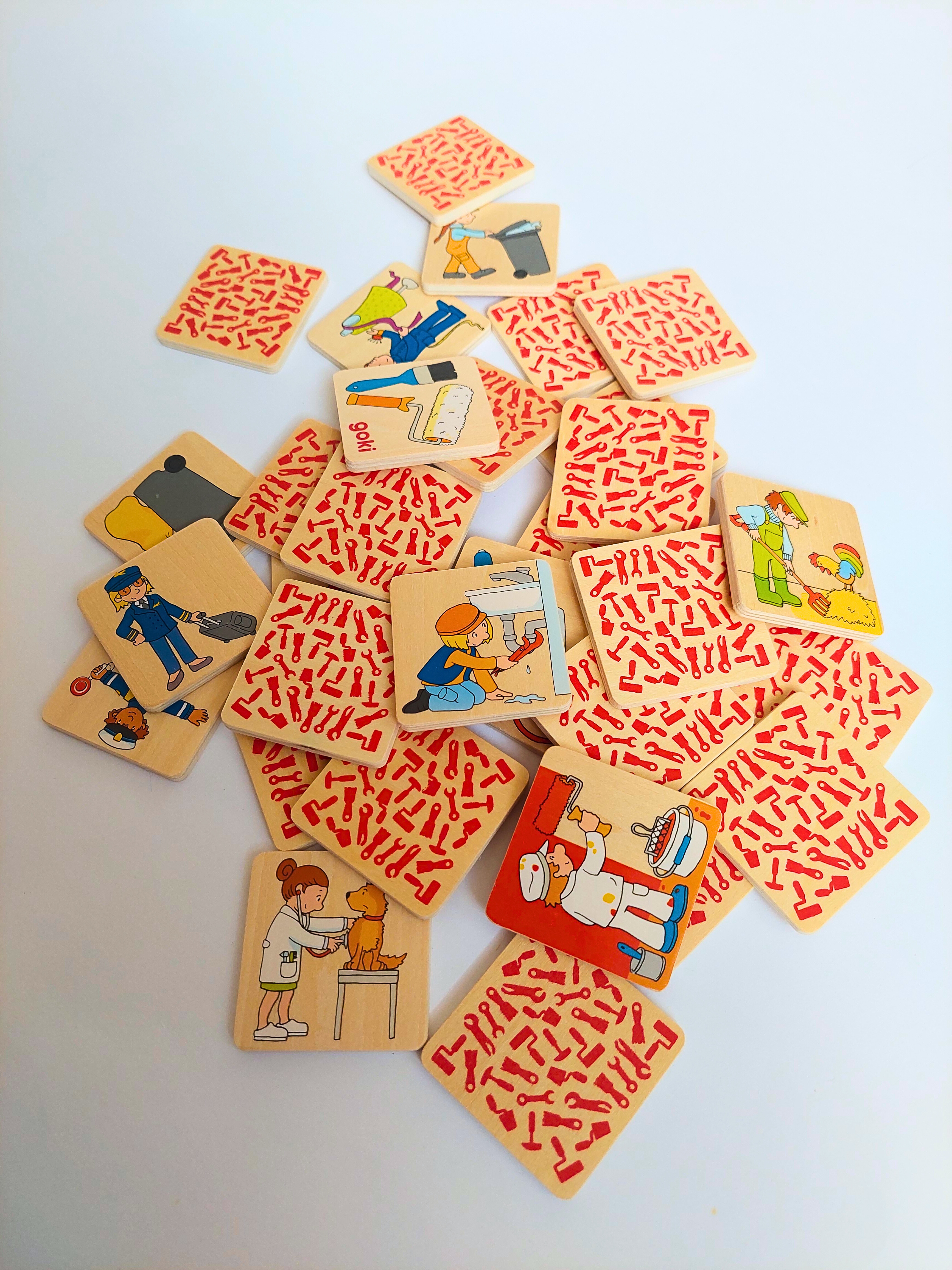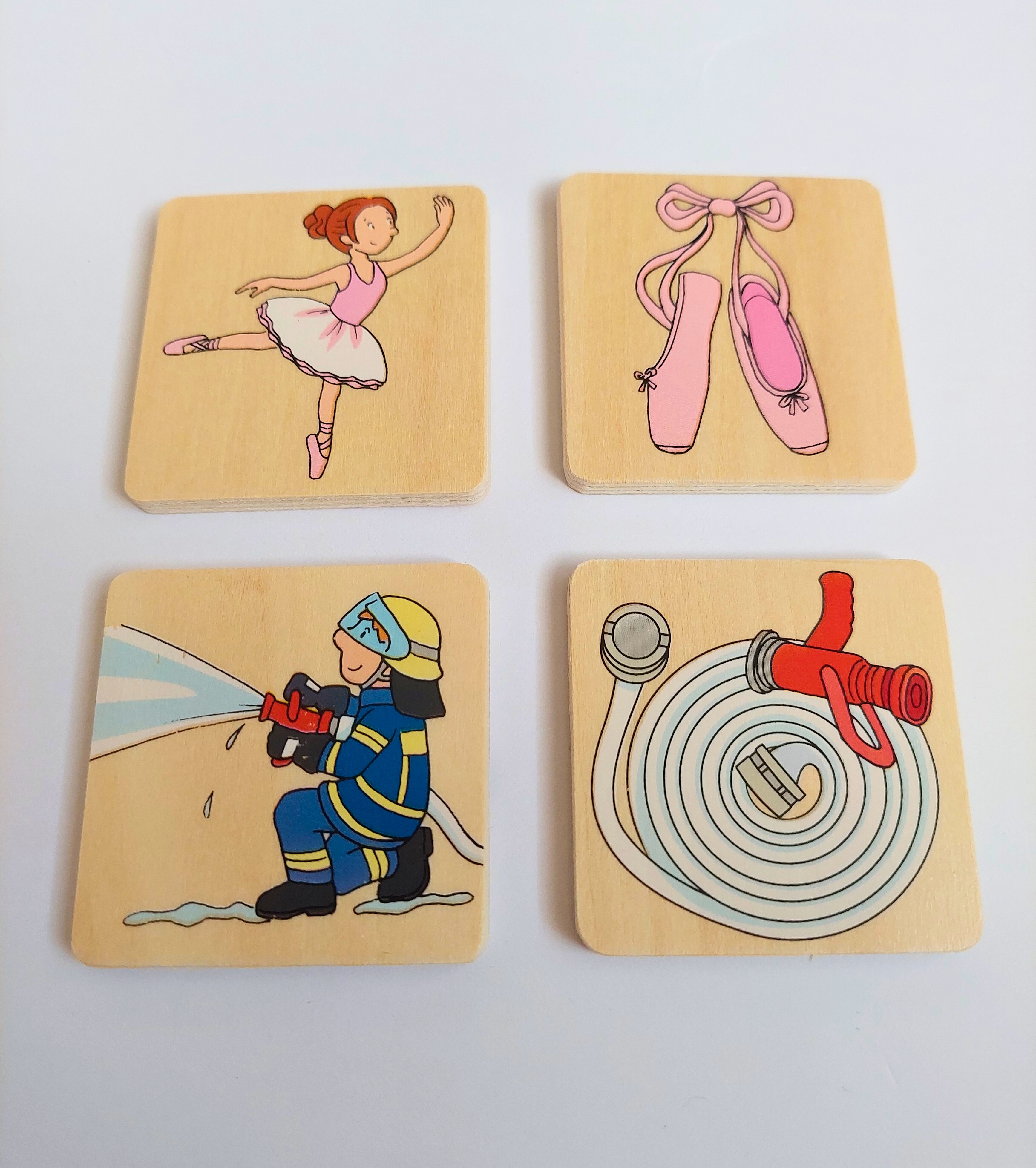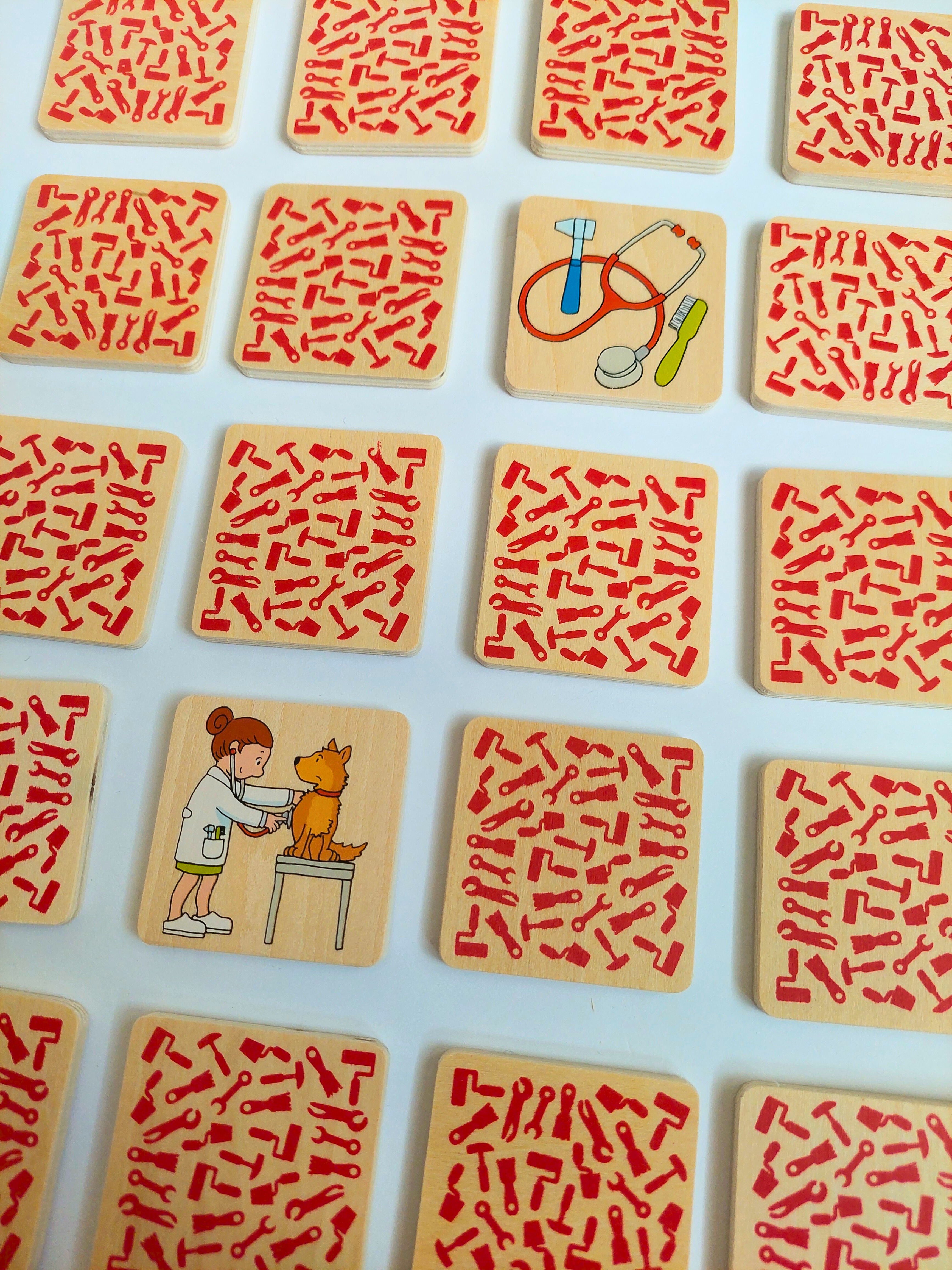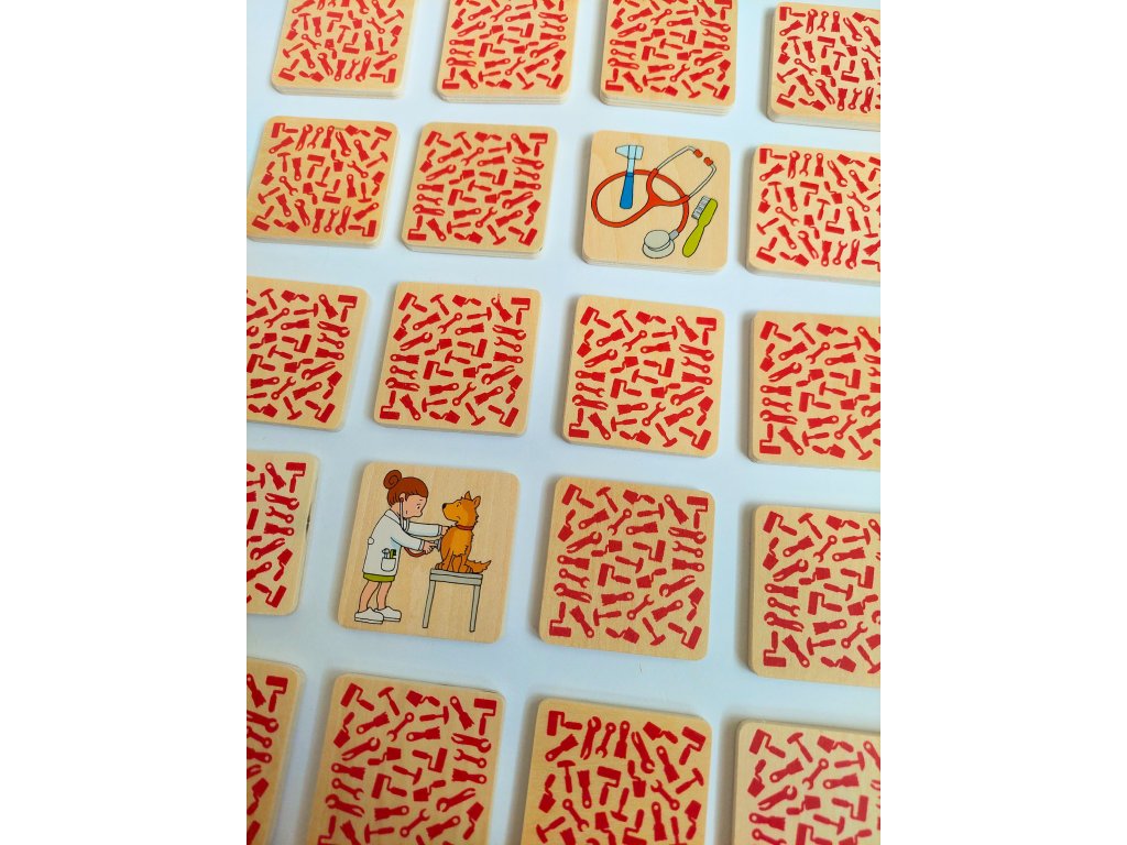 Netradiční dřevěné pexeso, ve kterém nehledáte 2 stejné obrázky. Hledá se vždy osoba, která vyvolává určité povolání a k ní předmět, který je k tomuto povolání nezbytný- např.: hasič + hadice.