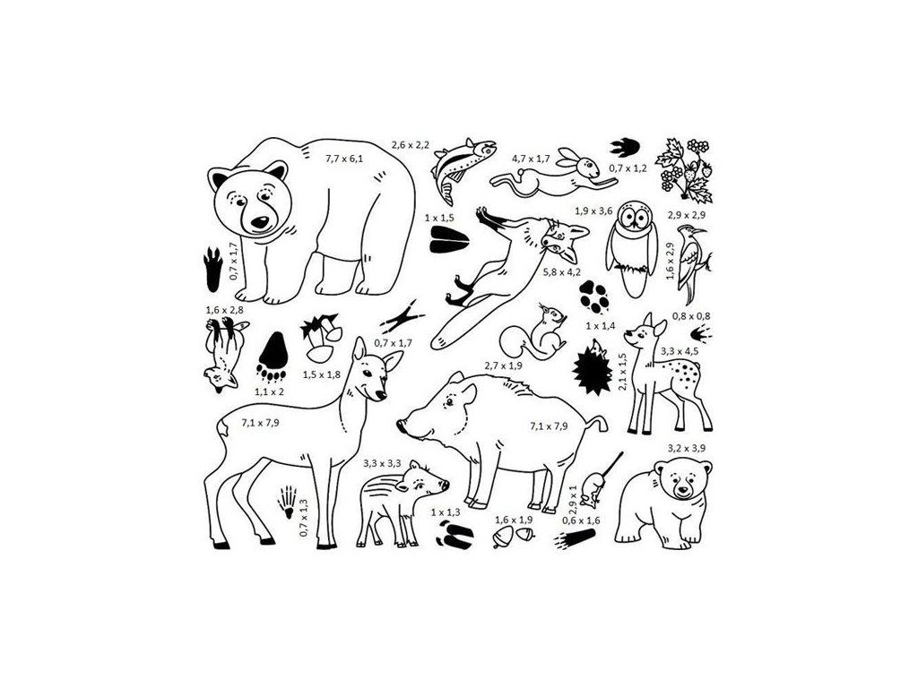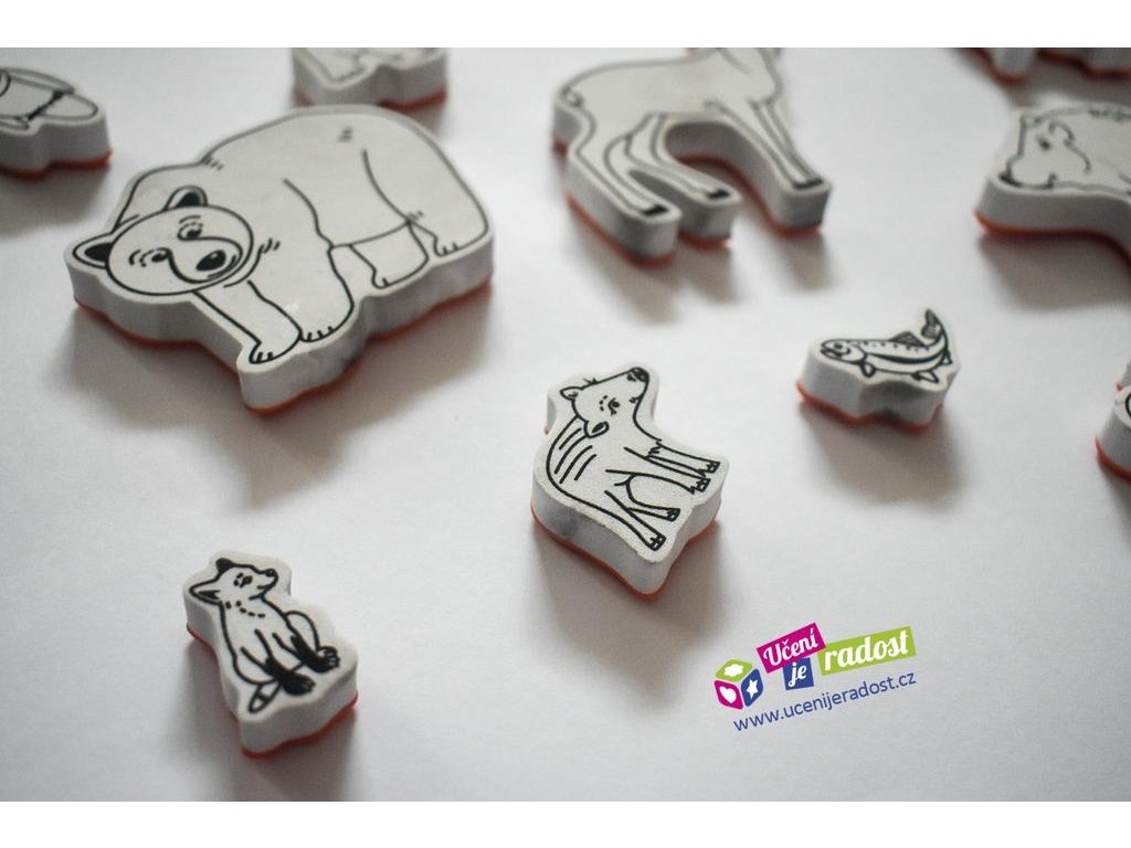 V sadě najdete razítka s obrázky zvířat a jejich mláďat, stopy a také obrázky toho, čím se živí.