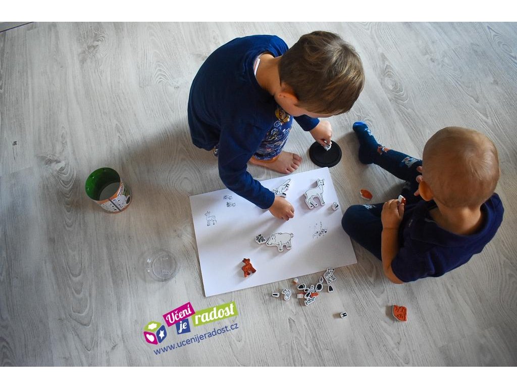 Máme zkušenost už se sadou stejných razítek - stroje na stavbě. Jelikož se nám velmi osvědčila, koupila jsem klukům stejná, ale s jinou tematikou. Lesní zvířátka v této sadě jsou skvělou pomůckou, kterou budeme využívat k obtiskávání, ale také k poznávání stop. Razítka se klukům v ruce dobře drží a nemusí na ně tlačit, aby vznikl hezký obrázek. Razítka si Alešek vybarvuje nebo stříhá. Jsou krásná a za mě doporučuji.