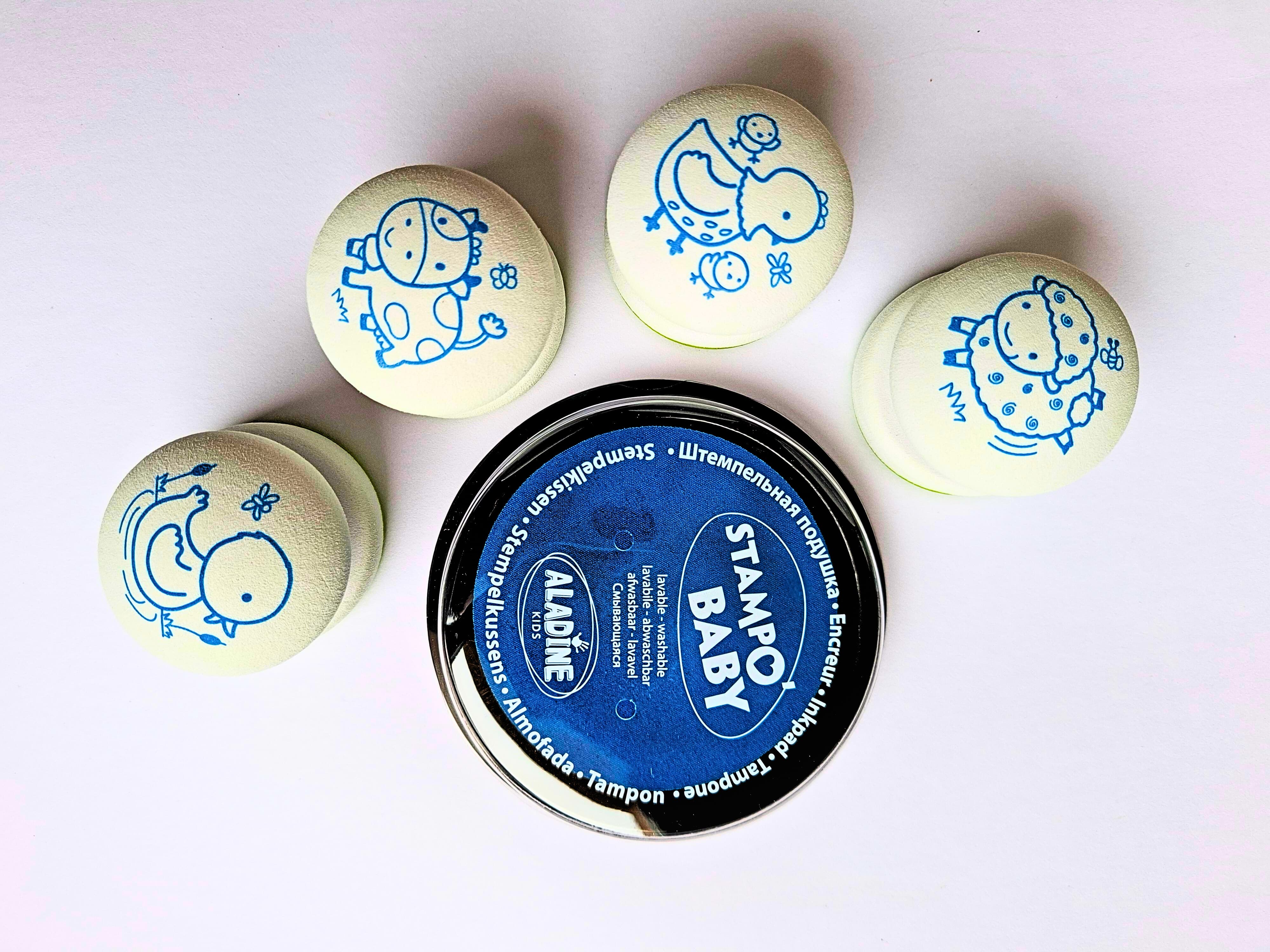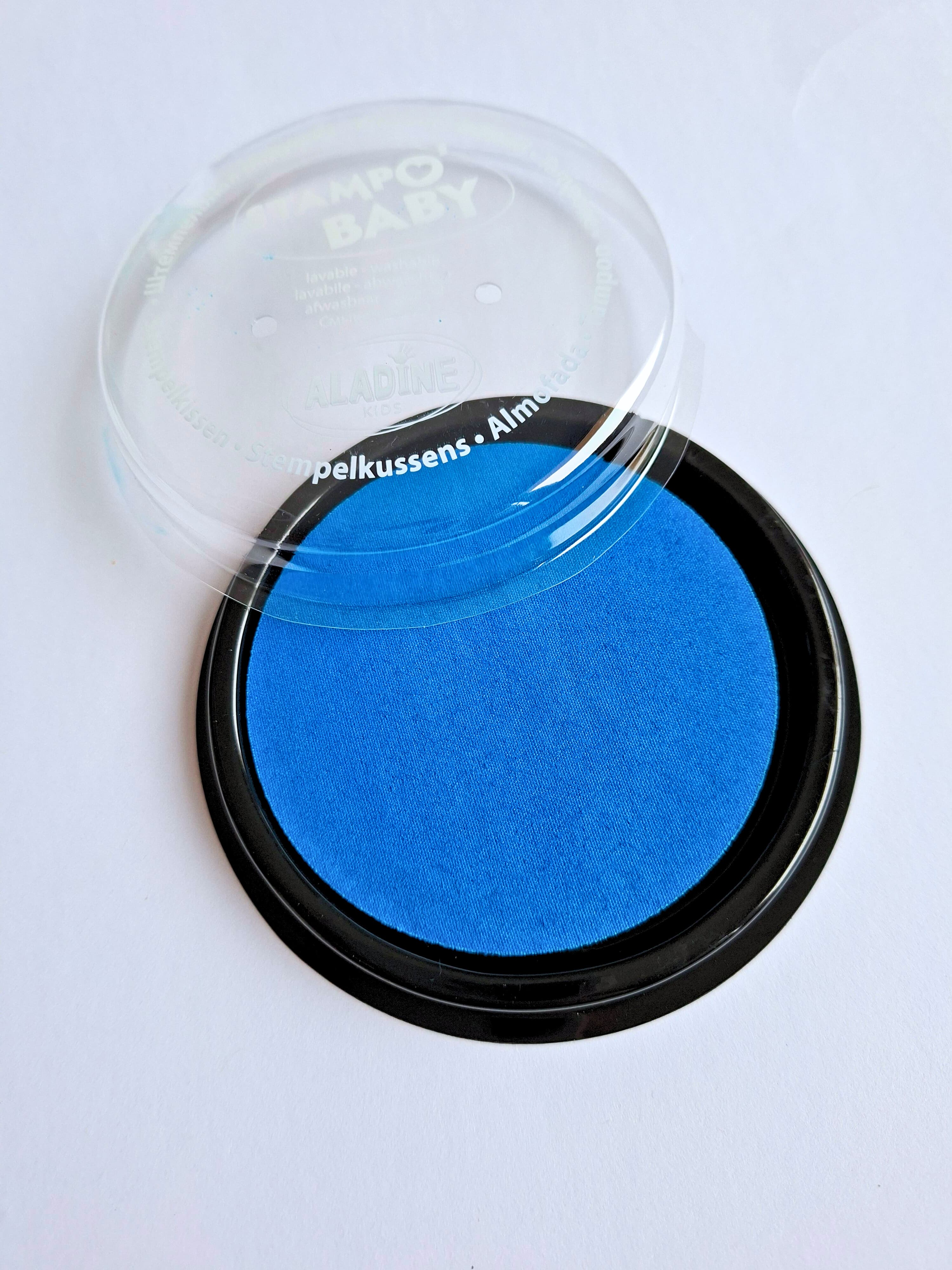 Inkoust má modru barvu. Celý inkoustový polštářek je uložen napevno v kulaté plastové krabičce, která má v průměru cca 10 cm. Inkoust je netoxický, proto nevadí, když dítě bude do barvy sahat prsty nebo se inkoust dostane do pusy či na tělo. Jde umýt bez problémů vodou z kůže a je lehce vypratelný z různých textilií.