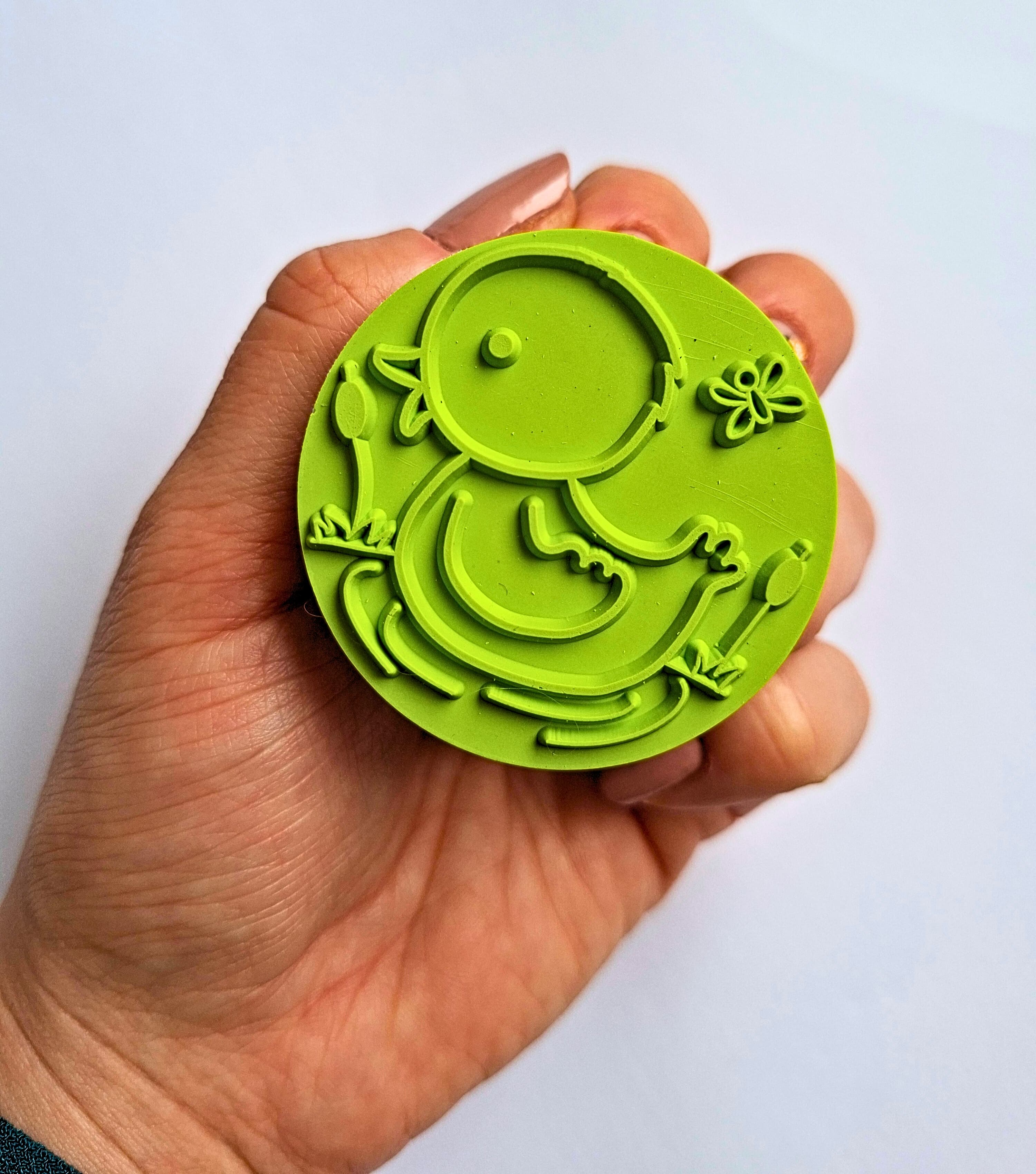 Obtisk má 5 cm a je přizpůsobený k další aktivitě – např. k vybarvení obtisku. Inkoust se po natisknutí nerozmazává, proto s ním můžeme hned dál pracovat.