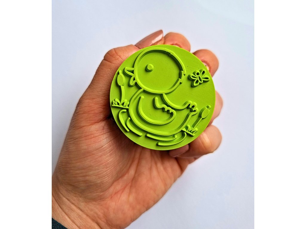 Obtisk má 5 cm a je přizpůsobený k další aktivitě – např. k vybarvení obtisku. Inkoust se po natisknutí nerozmazává, proto s ním můžeme hned dál pracovat.