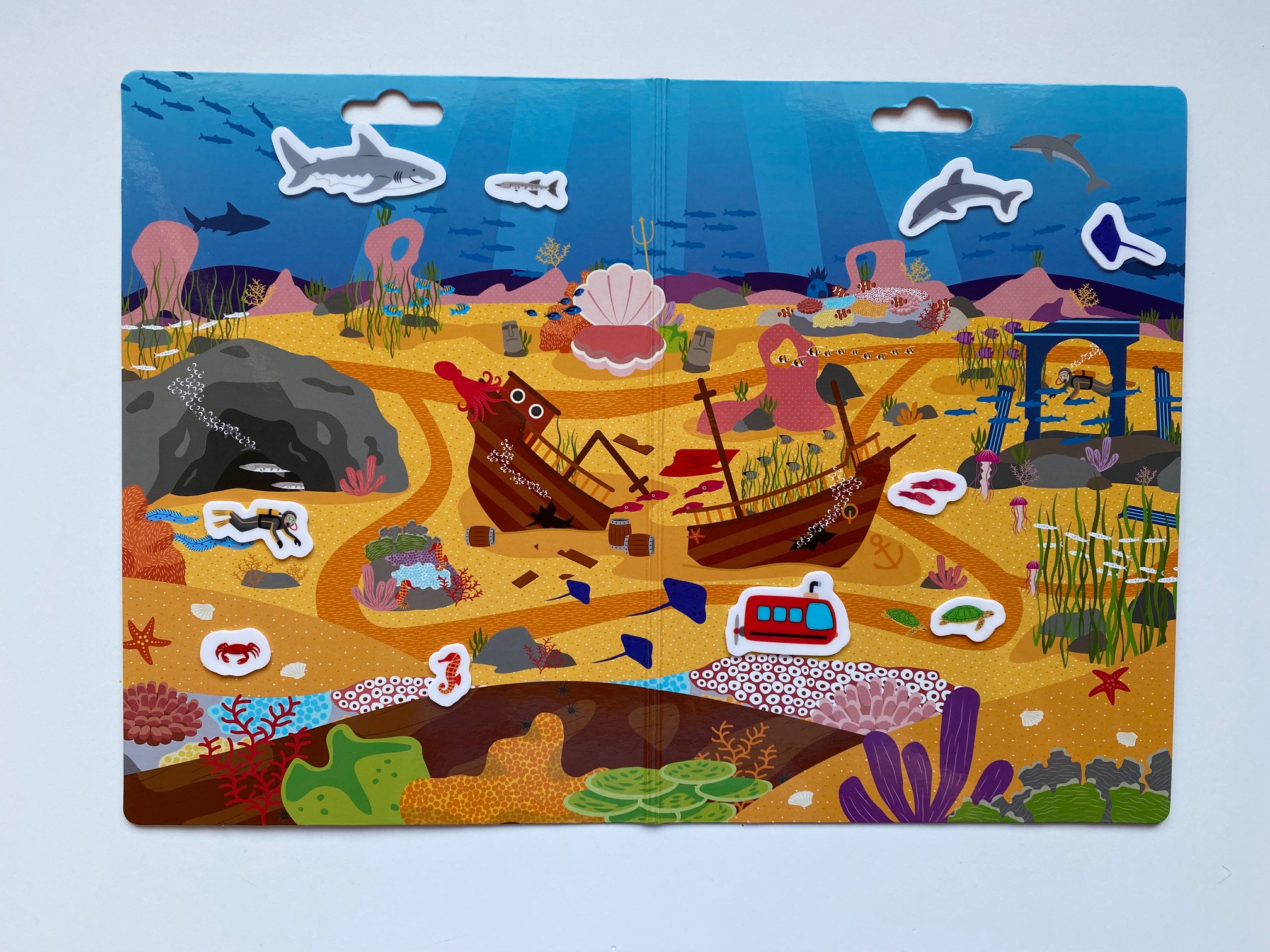 Součástí samolepek je předloha mořského dna, kam si děti mohou samolepky lepit a vytvářet tak své vlastní příběhy.