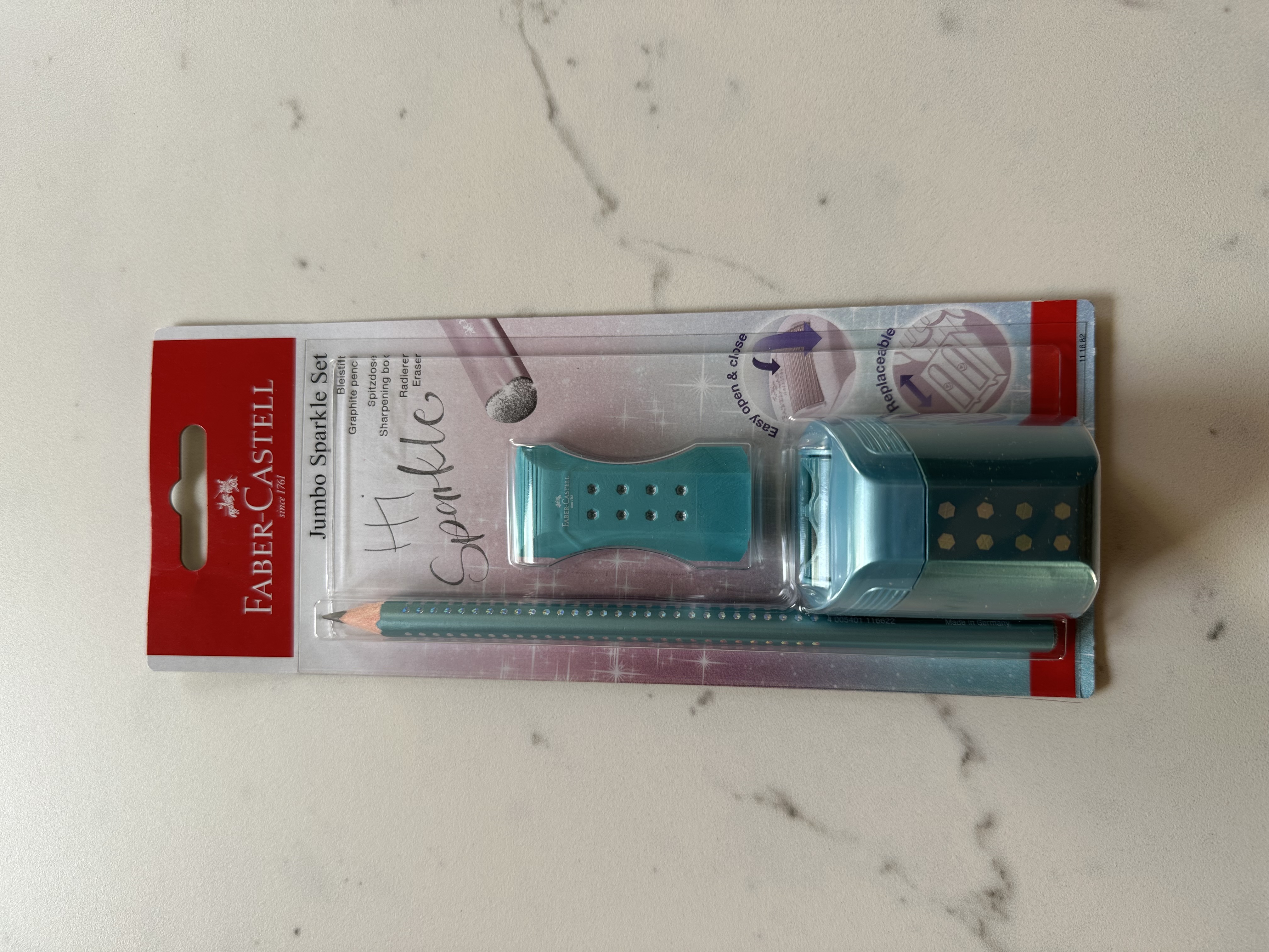 Sady grafitové tužky, ořezávátka a pryže Faber-Castell ve třech perleťových odstínech.