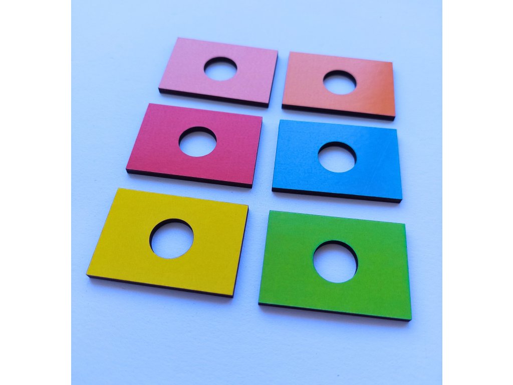 25 ks dřevěných barevných destiček s kruhovým otvorem uprostřed.