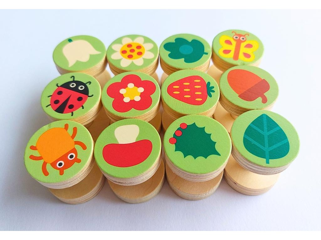 Oboustranné dřevěné válečky, které mají ideální velikost pro pohodlný úchop. Na každém válečku je jeden obrázek ale pozor! Z jedné strany je čistě barevný obrázek bez vzorů a z druhé strany je stejný obrázek, ale s detaily.