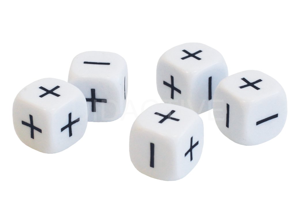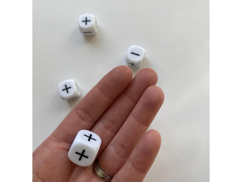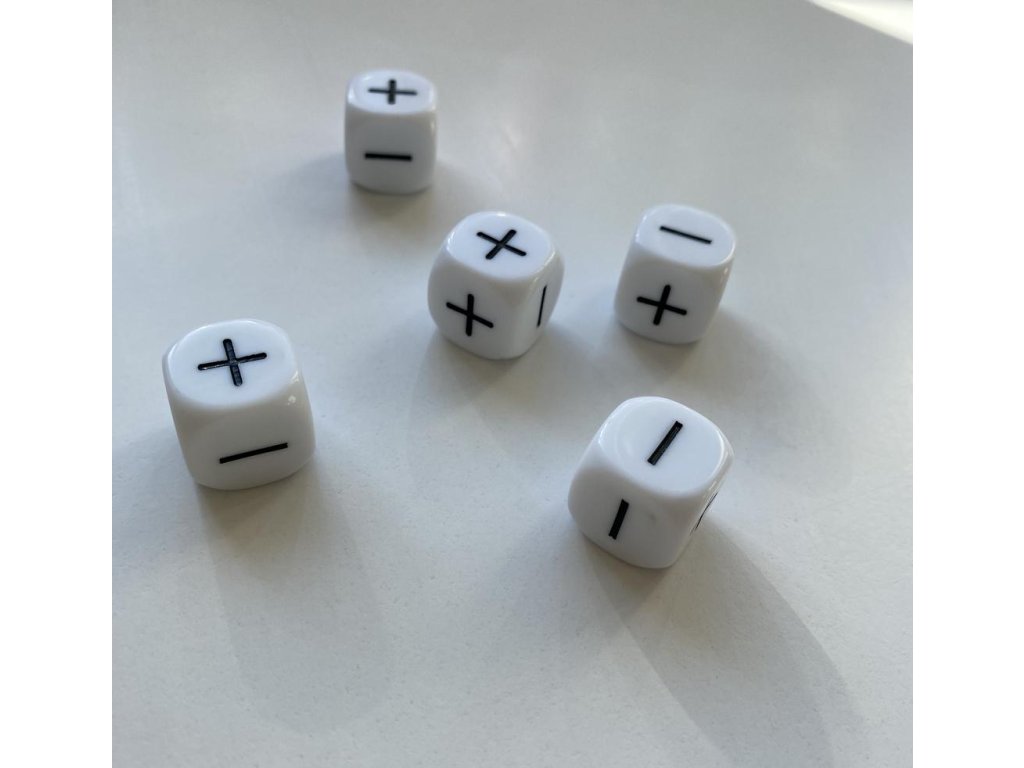 V balení najdete 5 ks bílých kostek, které mají na stranách tři + a tři -.