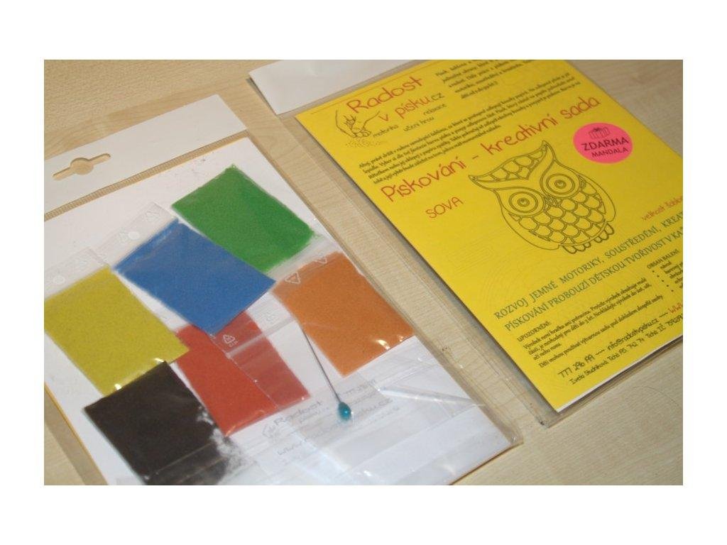 - barevný písek - 6 ks ( červený, modrý, žlutý, zelený, černý, oranžový) - vystačí na cca 4-6 šablon A5